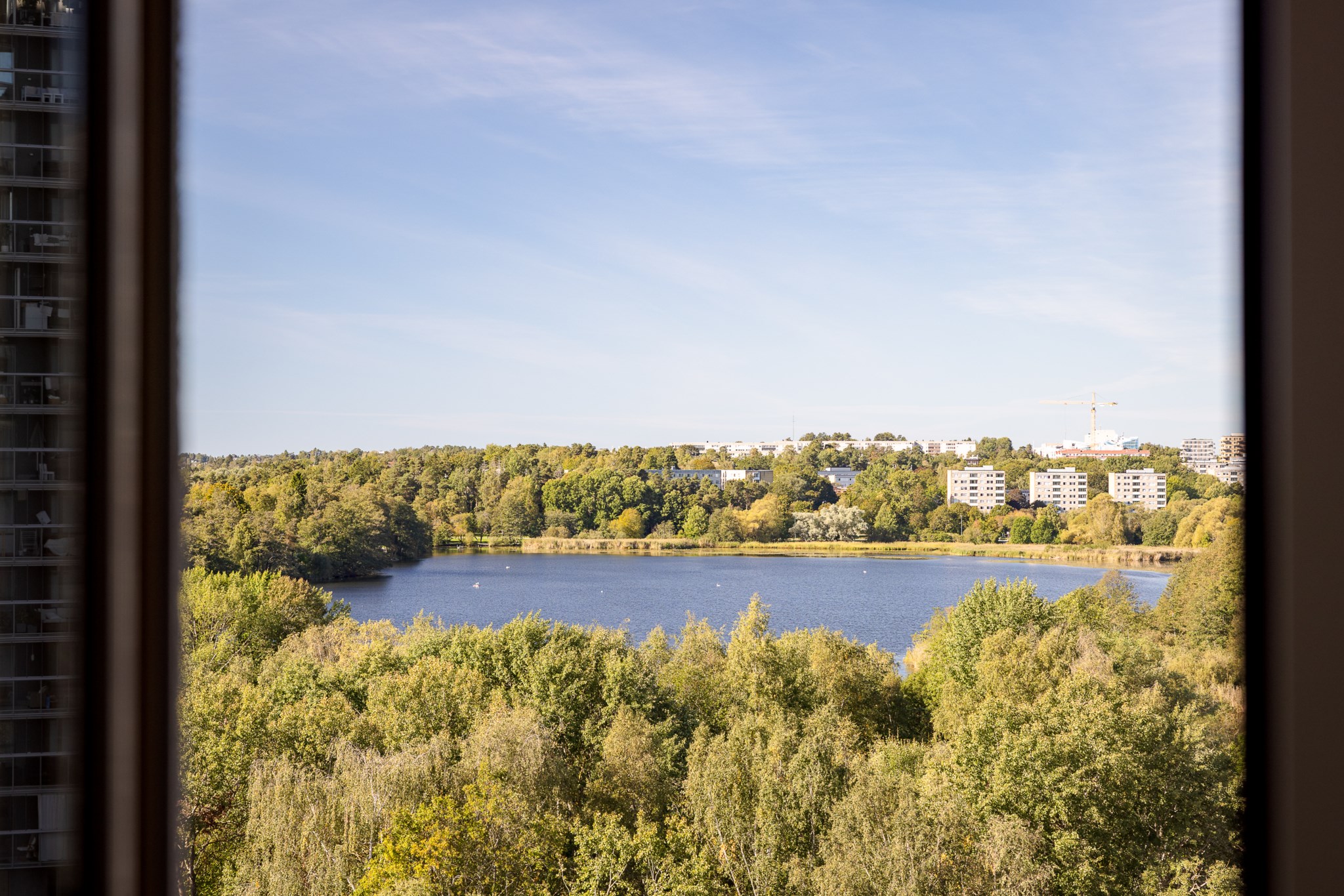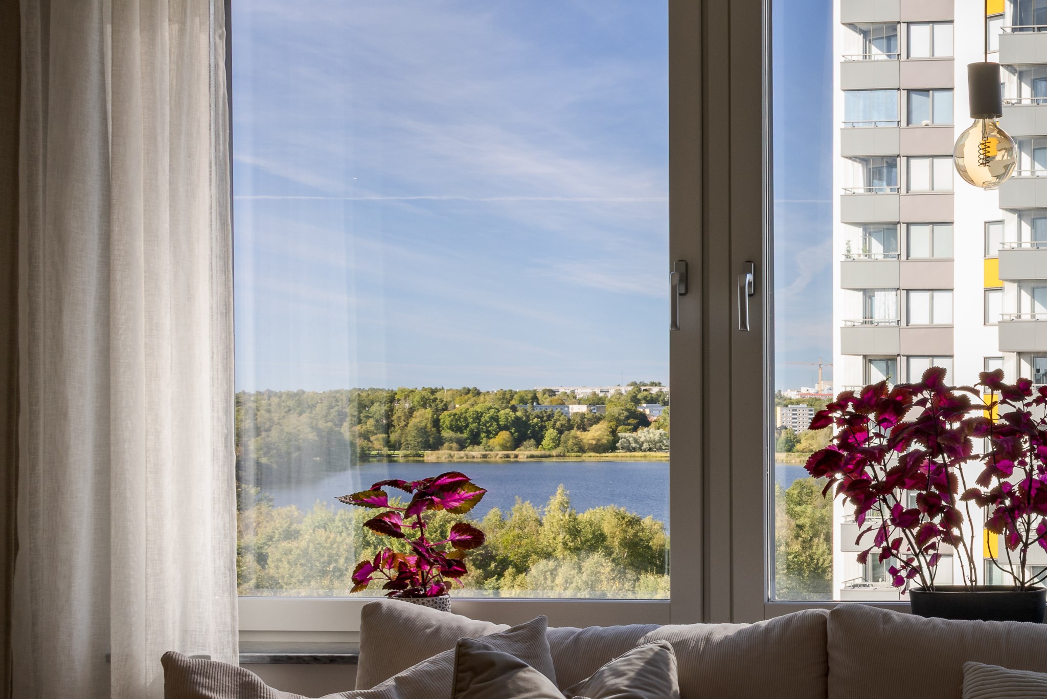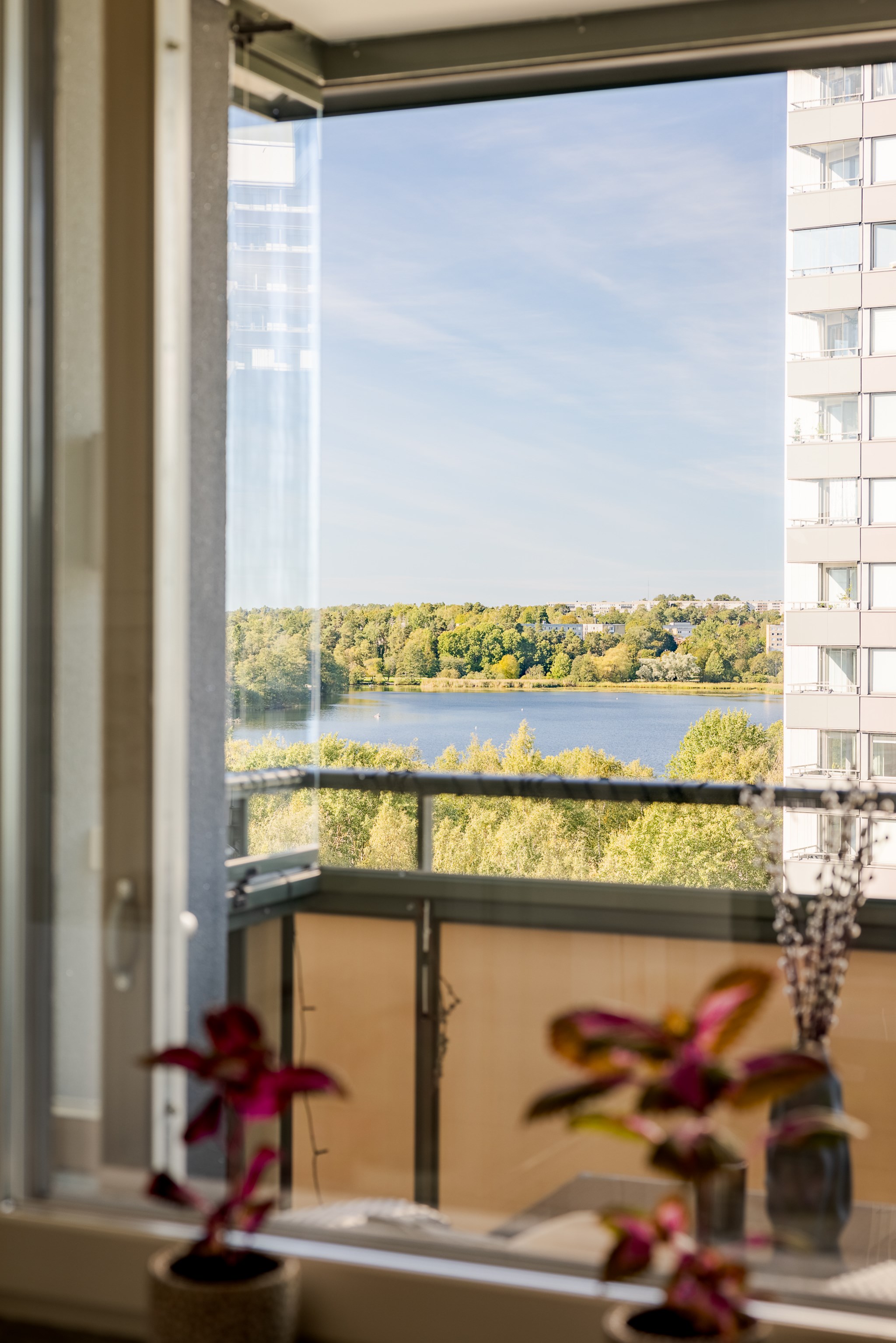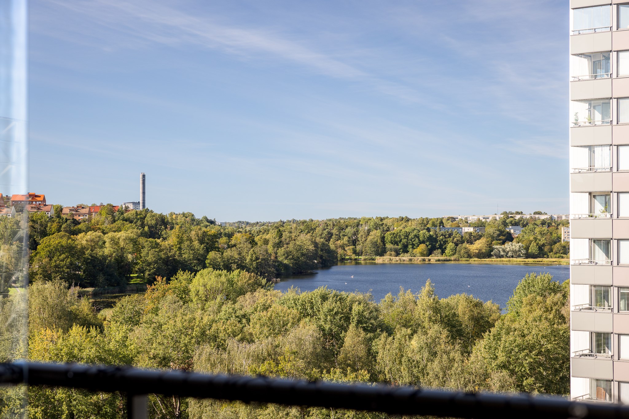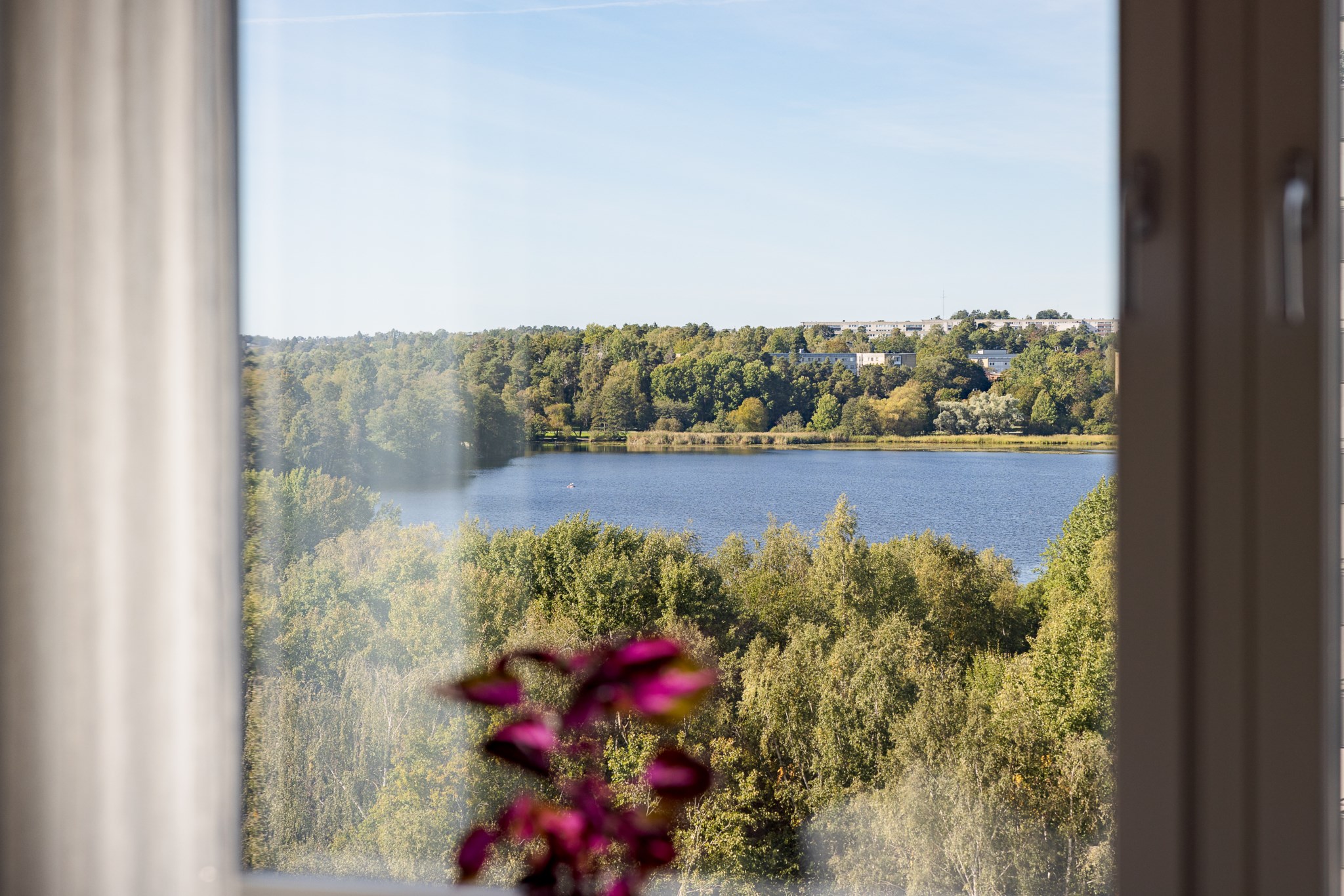 Redan vid entrén möts du av gedigen känsla – ljus glasfasad mot gatan, hiss som tar dig upp till våningen där panoramablicken väntar. Från fönster och balkong sträcker sig utsikten över det nästan spegelblanka vattnet, grönskan runt sjön och silhuetten i fjärran – en tavla som ständigt förändras med årstidens skiftningar.