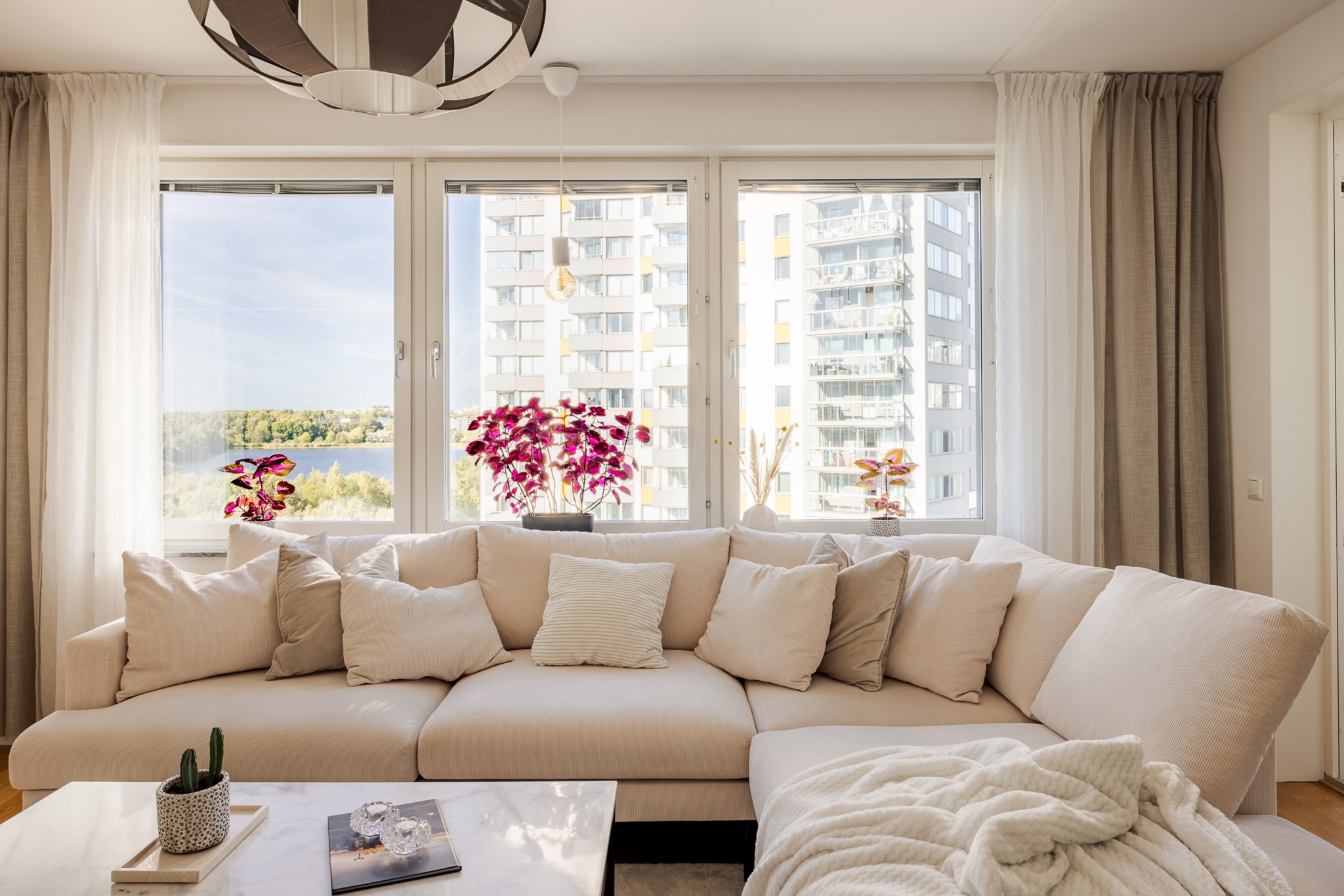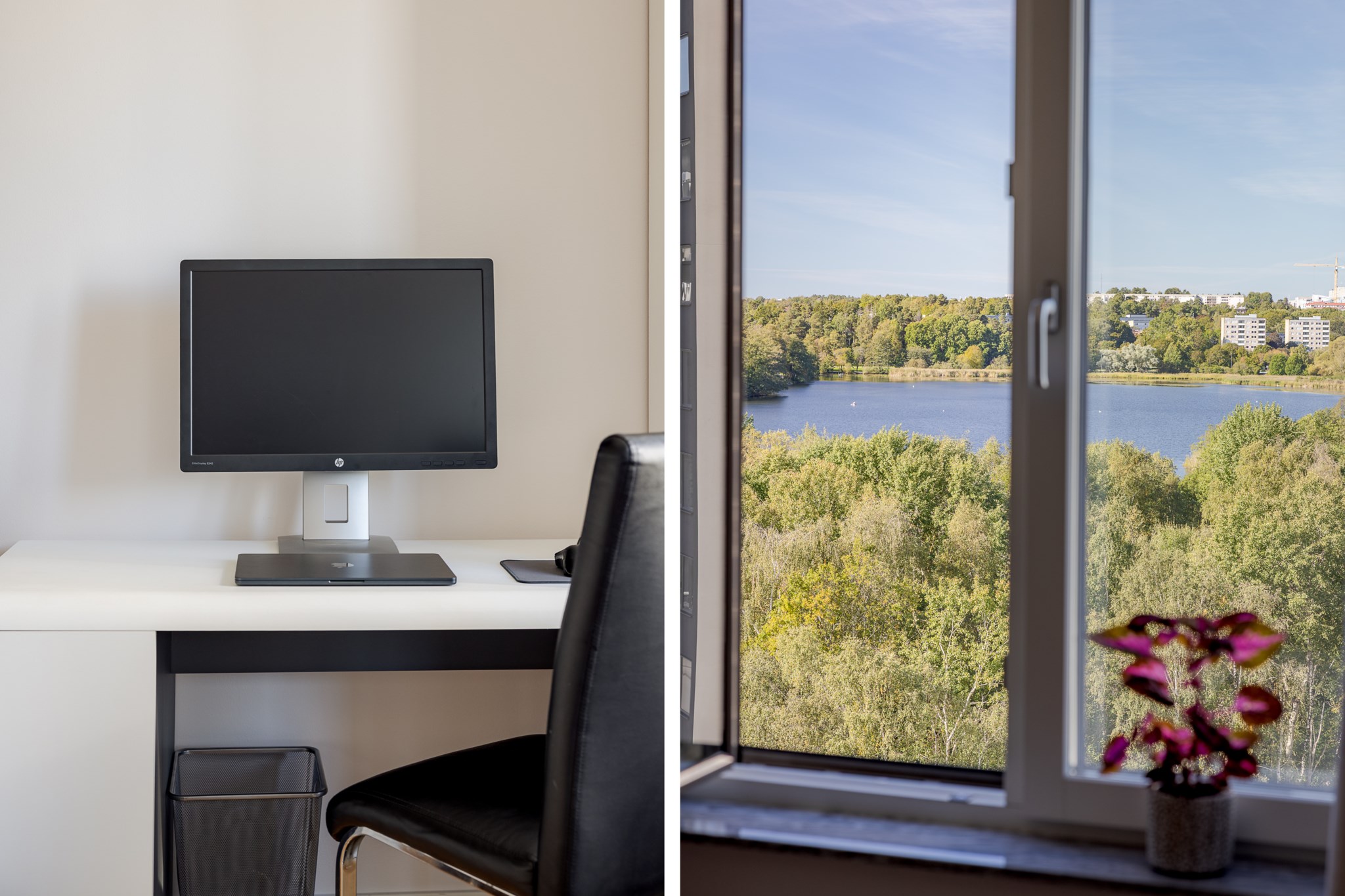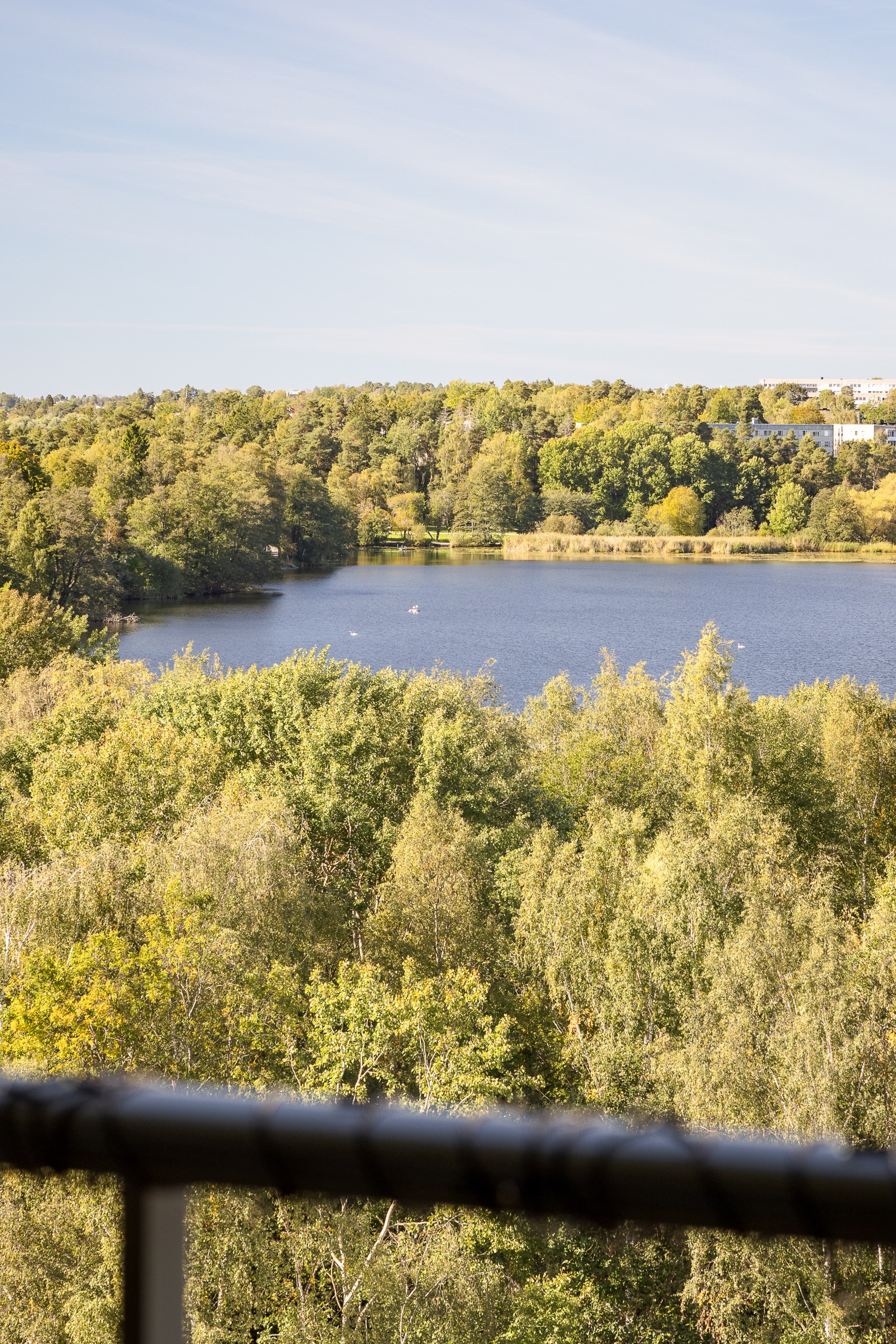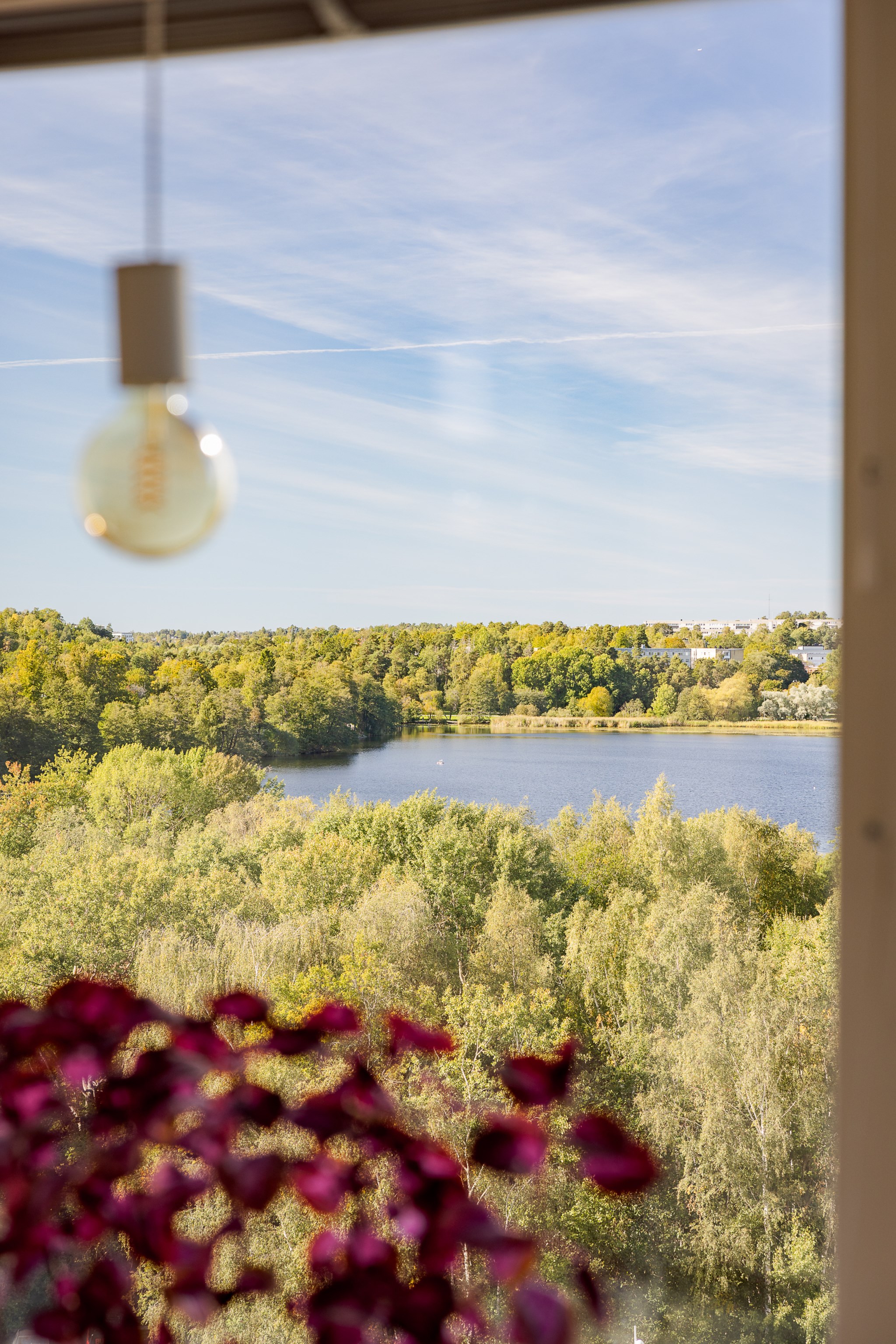 Redan vid entrén möts du av gedigen känsla – ljus glasfasad mot gatan, hiss som tar dig upp till våningen där panoramablicken väntar. Från fönster och balkong sträcker sig utsikten över det nästan spegelblanka vattnet, grönskan runt sjön och silhuetten i fjärran – en tavla som ständigt förändras med årstidens skiftningar.