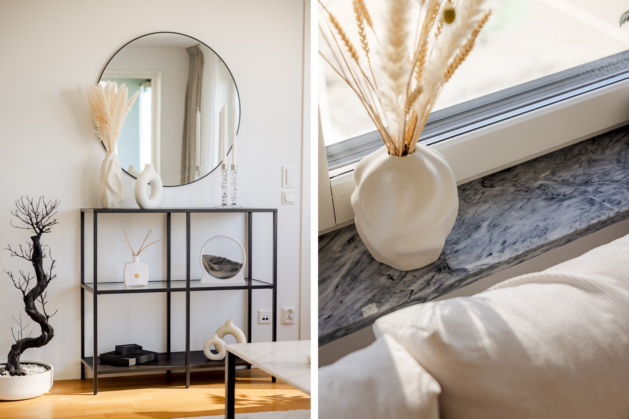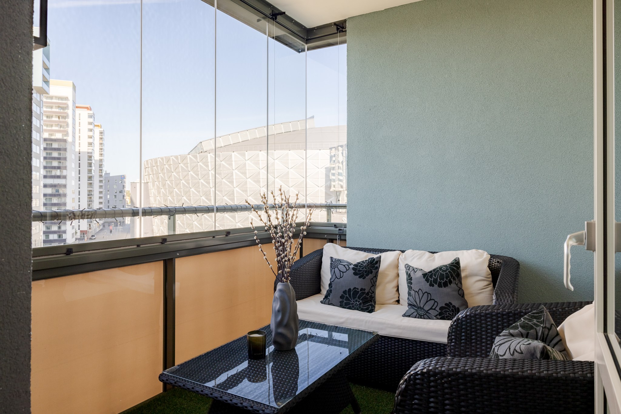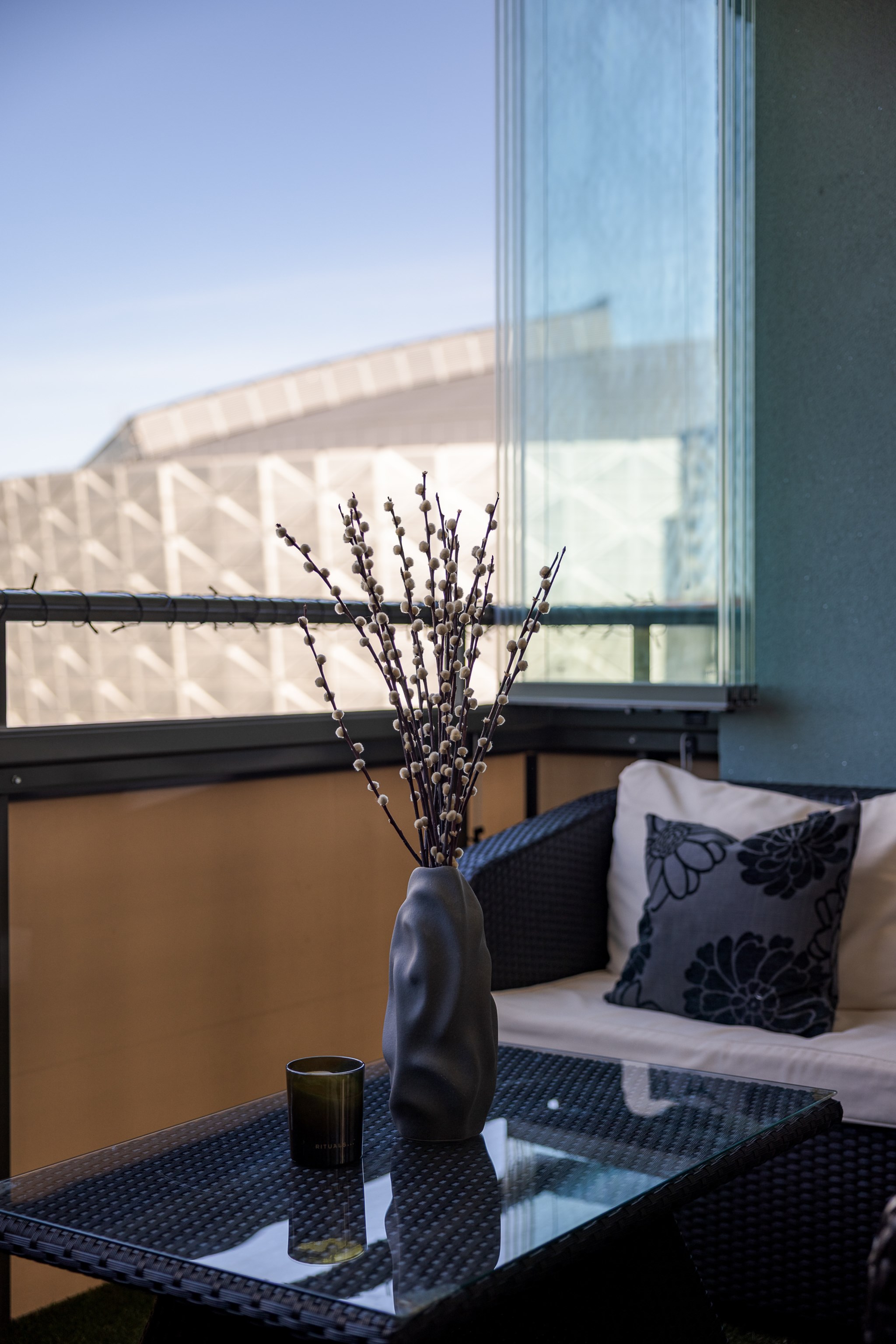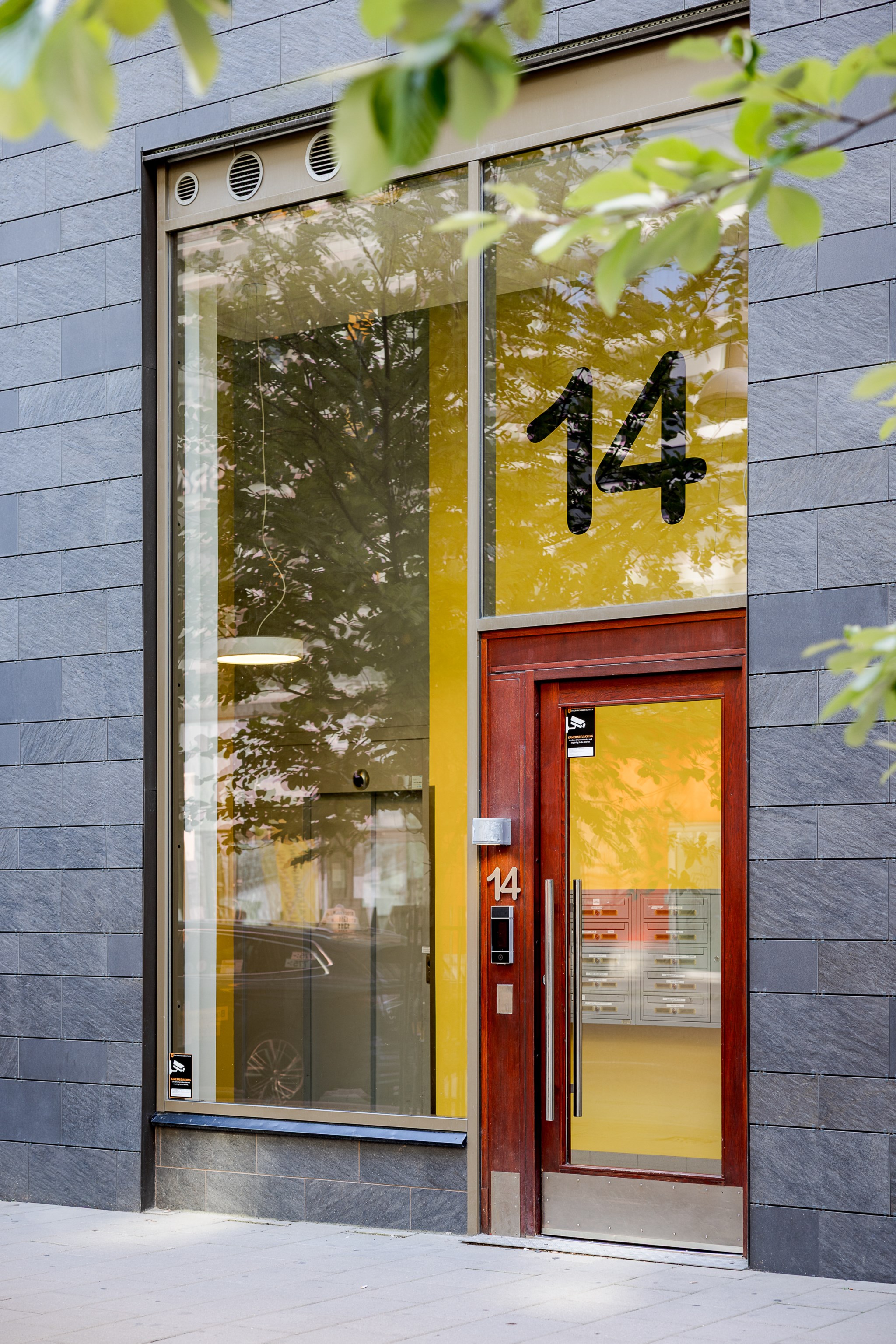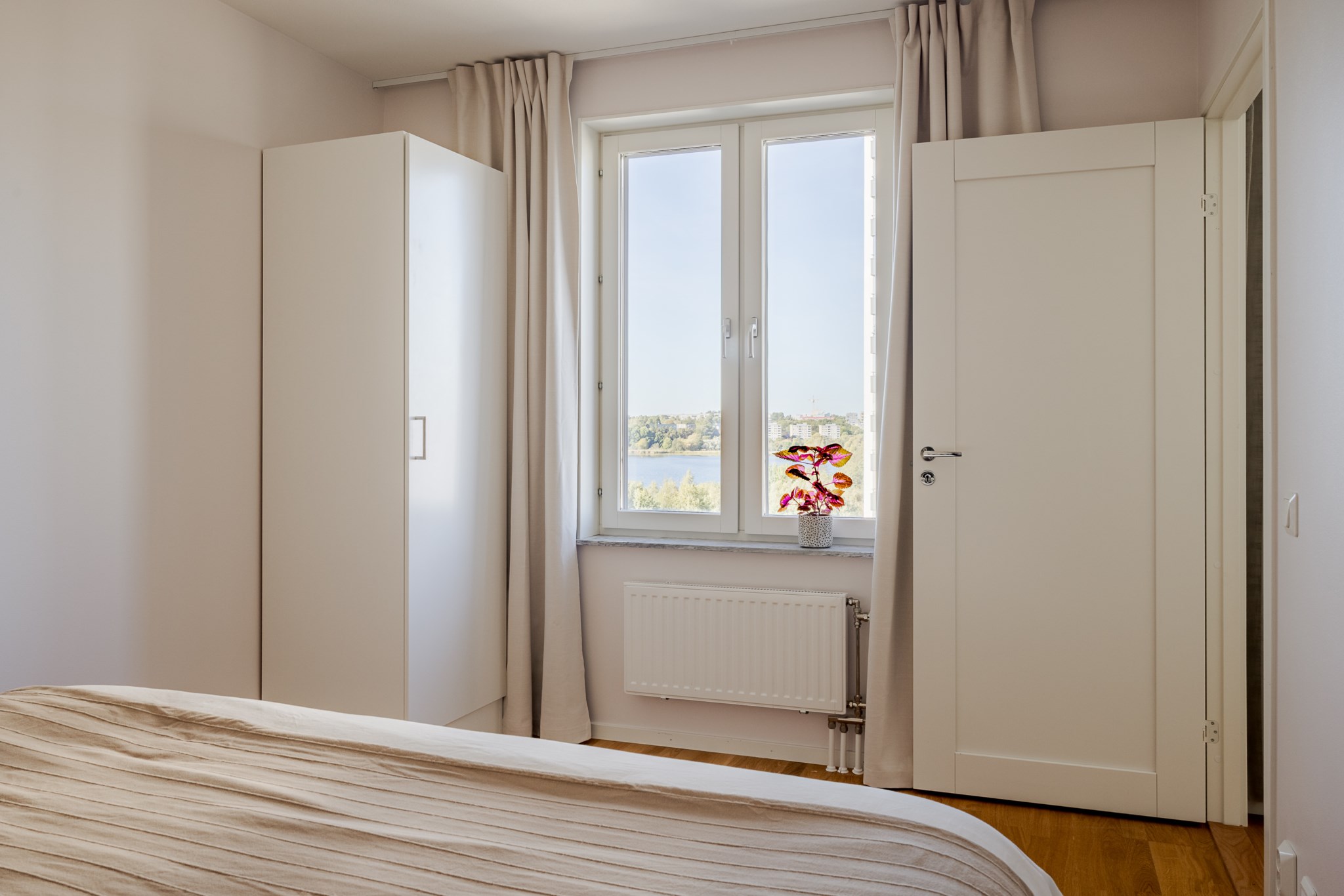 Redan vid entrén möts du av gedigen känsla – ljus glasfasad mot gatan, hiss som tar dig upp till våningen där panoramablicken väntar. Från fönster och balkong sträcker sig utsikten över det nästan spegelblanka vattnet, grönskan runt sjön och silhuetten i fjärran – en tavla som ständigt förändras med årstidens skiftningar.