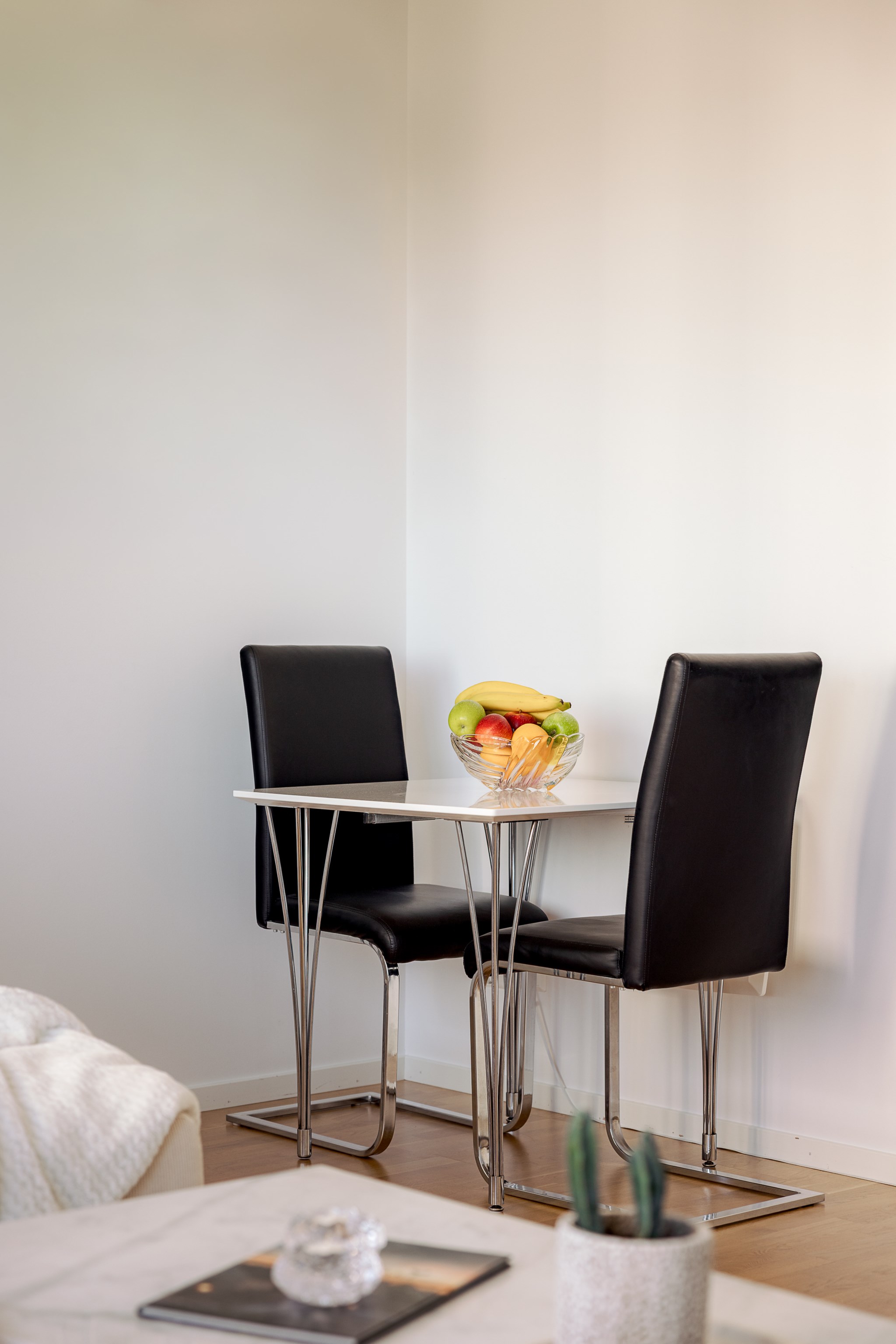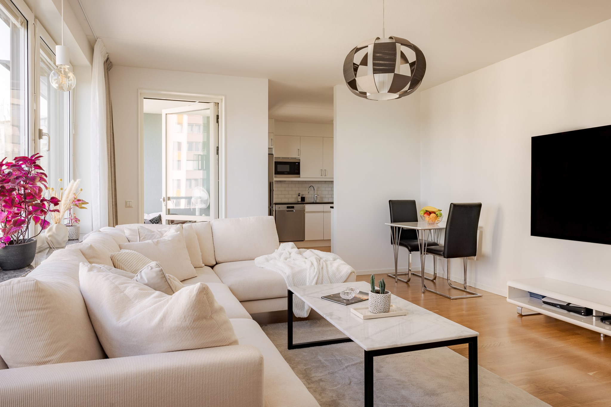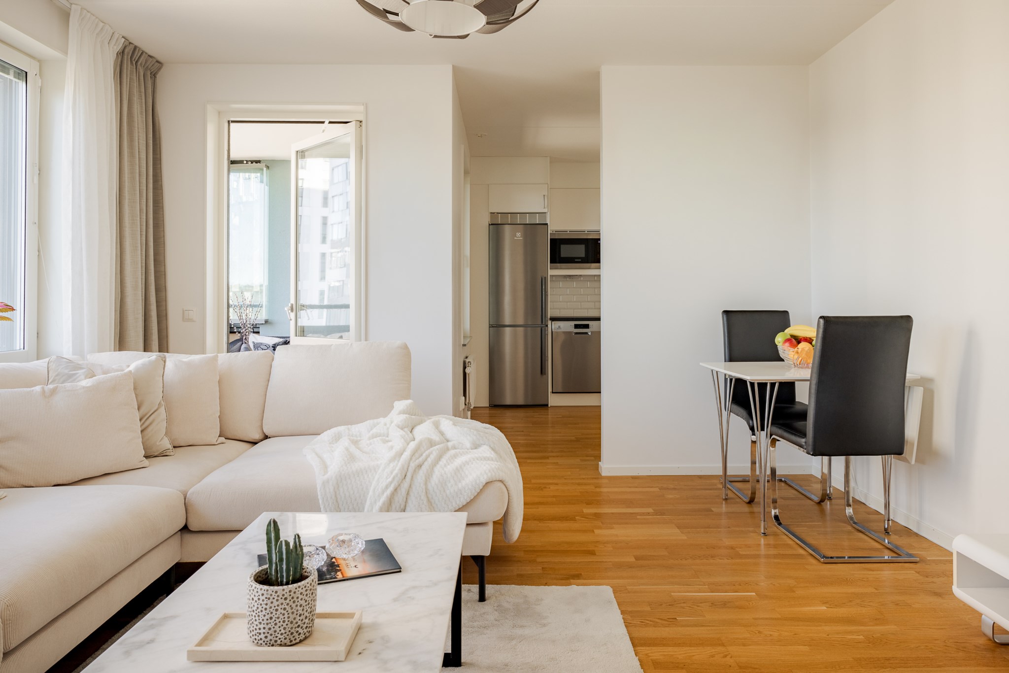 I det öppna vardagsrummet möts du av stora fönsterpartier som släpper in generöst med dagsljus, och den öppna planlösningen mot köket skapar ett flexibelt hem för både vardag och umgänge. Här finns plats för matsalsdel, soffa och blickar som når långt. Från rummet når du balkongen där du under bar himmel kan njuta av både morgonkaffe och kvällsvärme – med sjöutsikten som ständigt följer dig.
