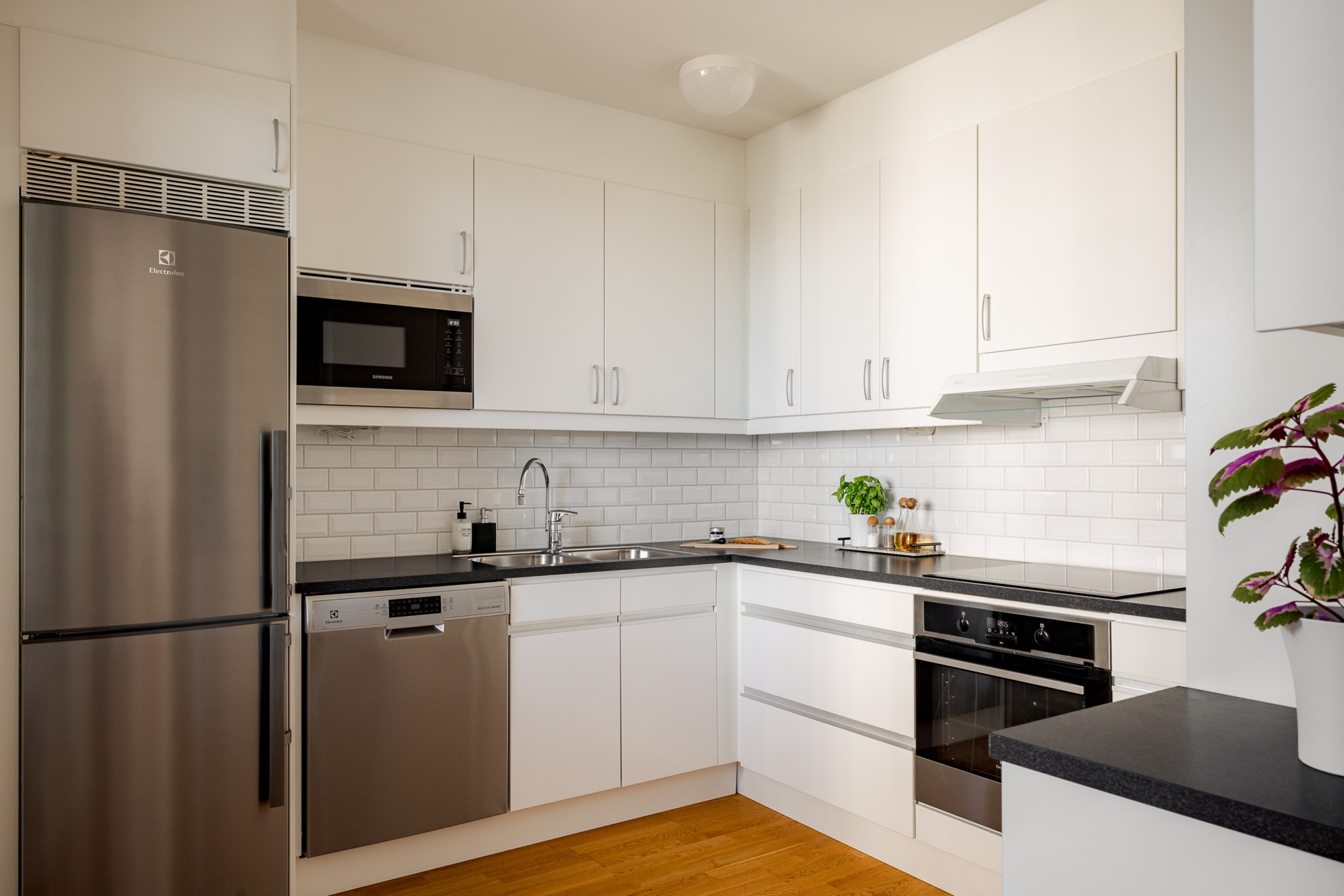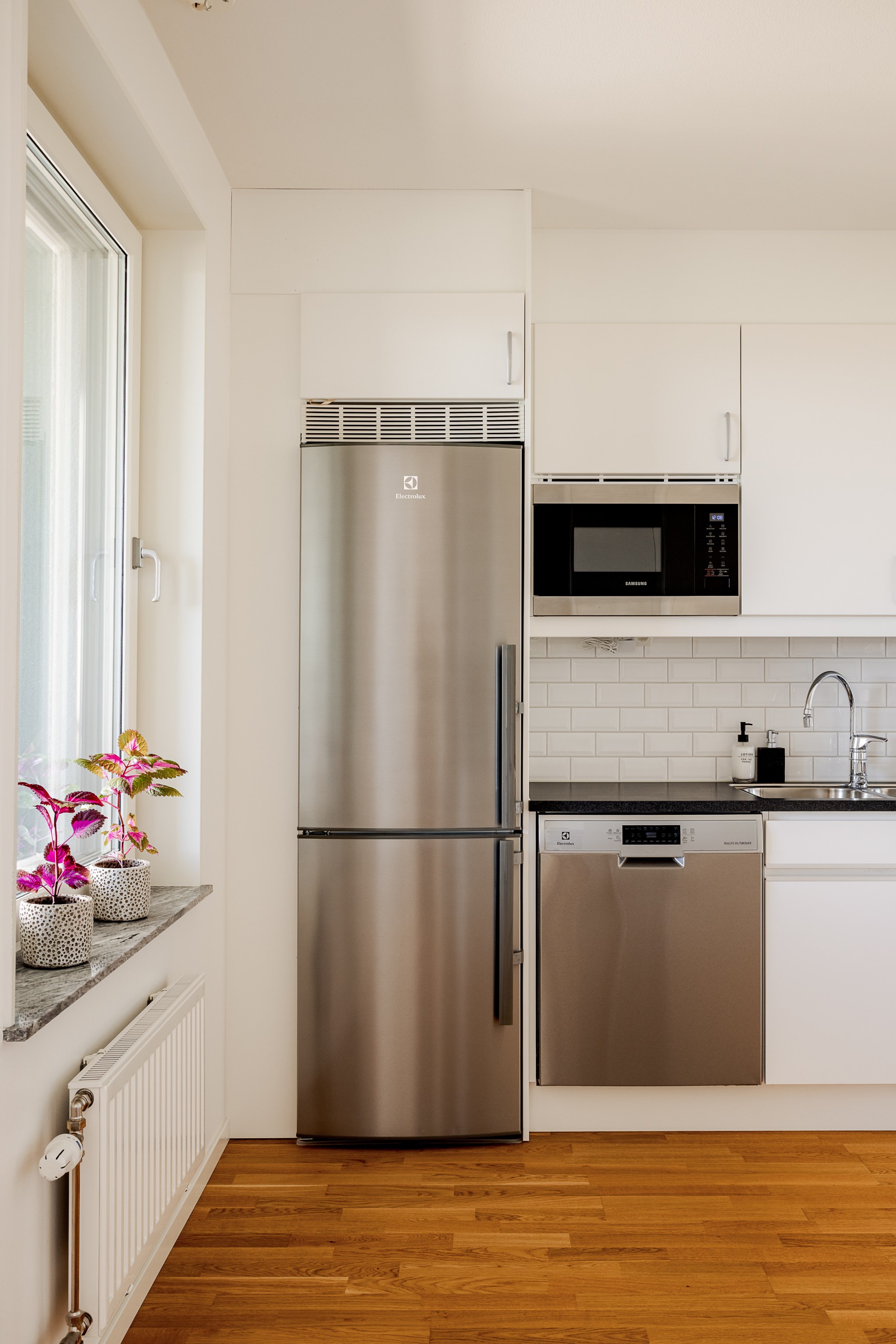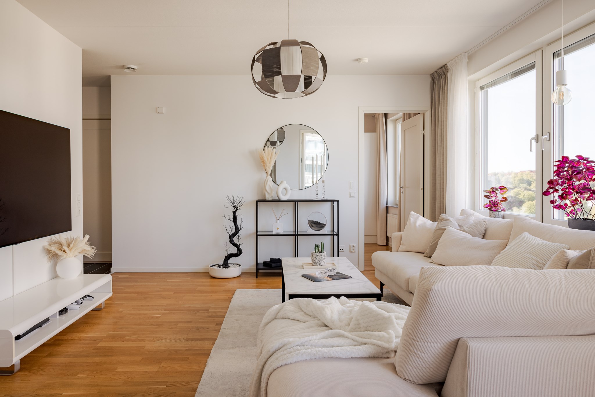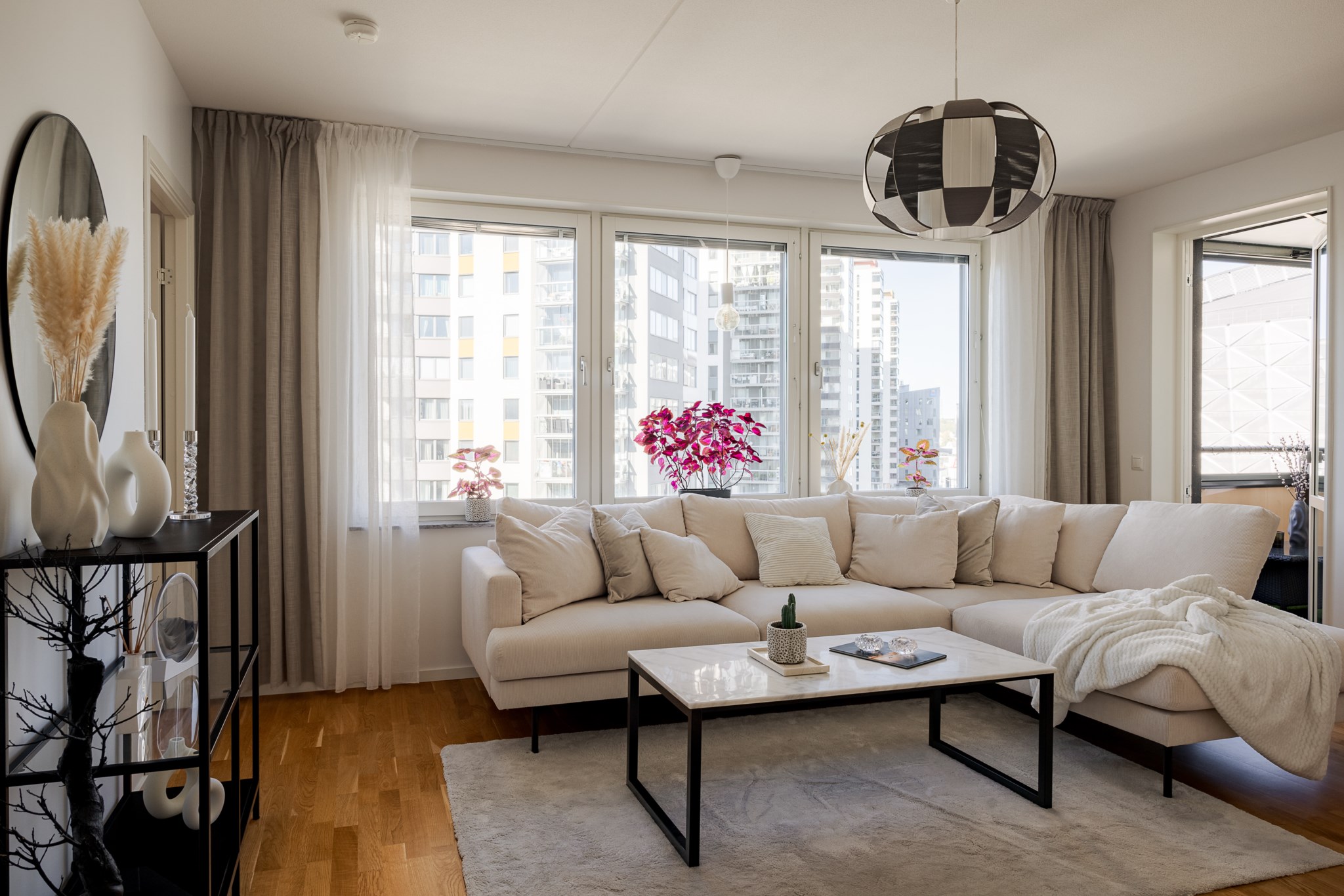 I det öppna vardagsrummet möts du av stora fönsterpartier som släpper in generöst med dagsljus, och den öppna planlösningen mot köket skapar ett flexibelt hem för både vardag och umgänge. Här finns plats för matsalsdel, soffa och blickar som når långt. Från rummet når du balkongen där du under bar himmel kan njuta av både morgonkaffe och kvällsvärme – med sjöutsikten som ständigt följer dig.