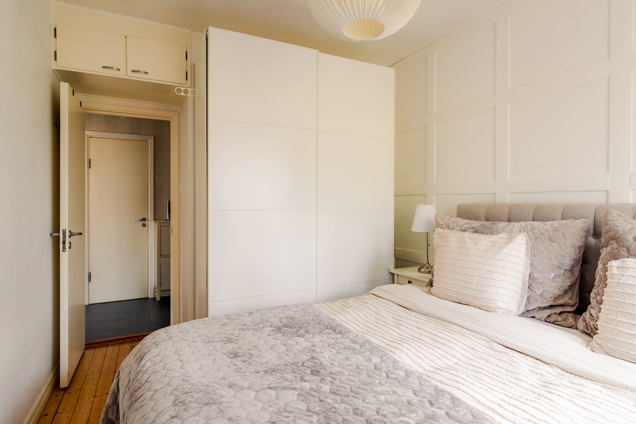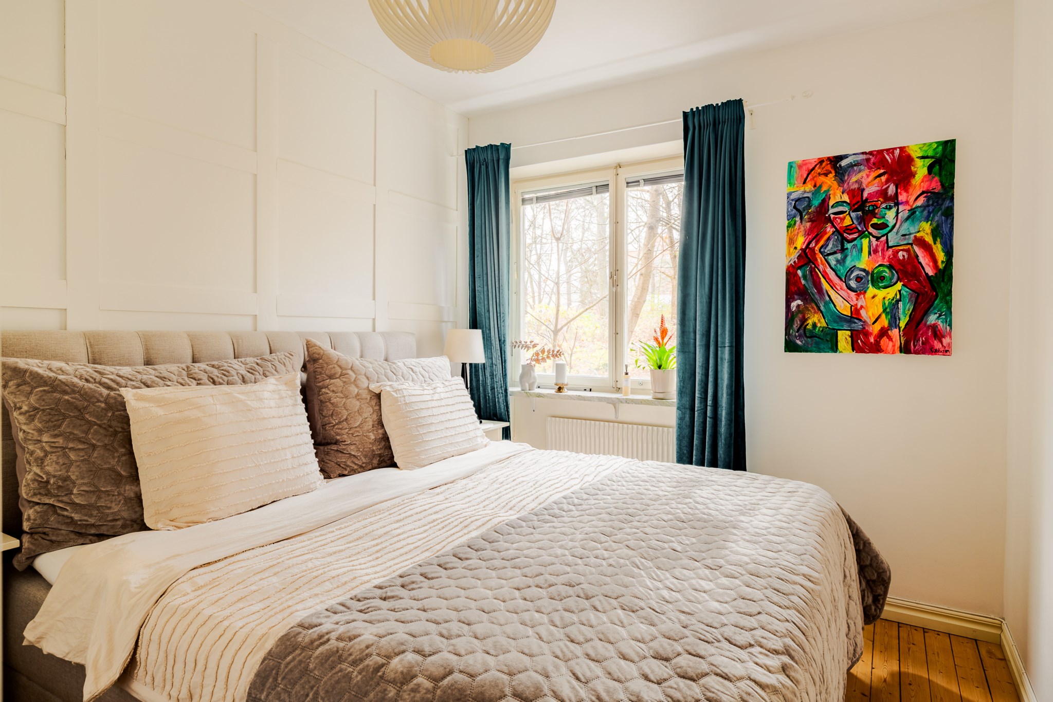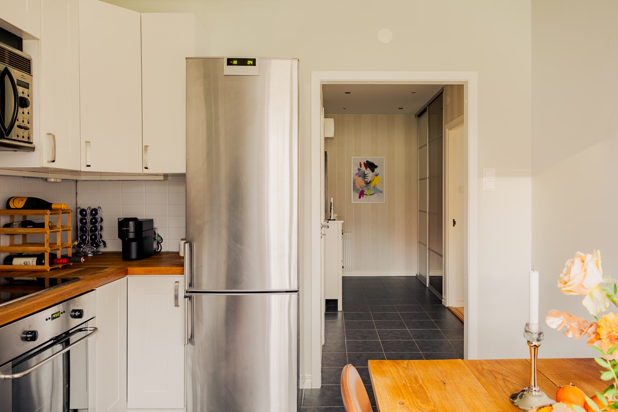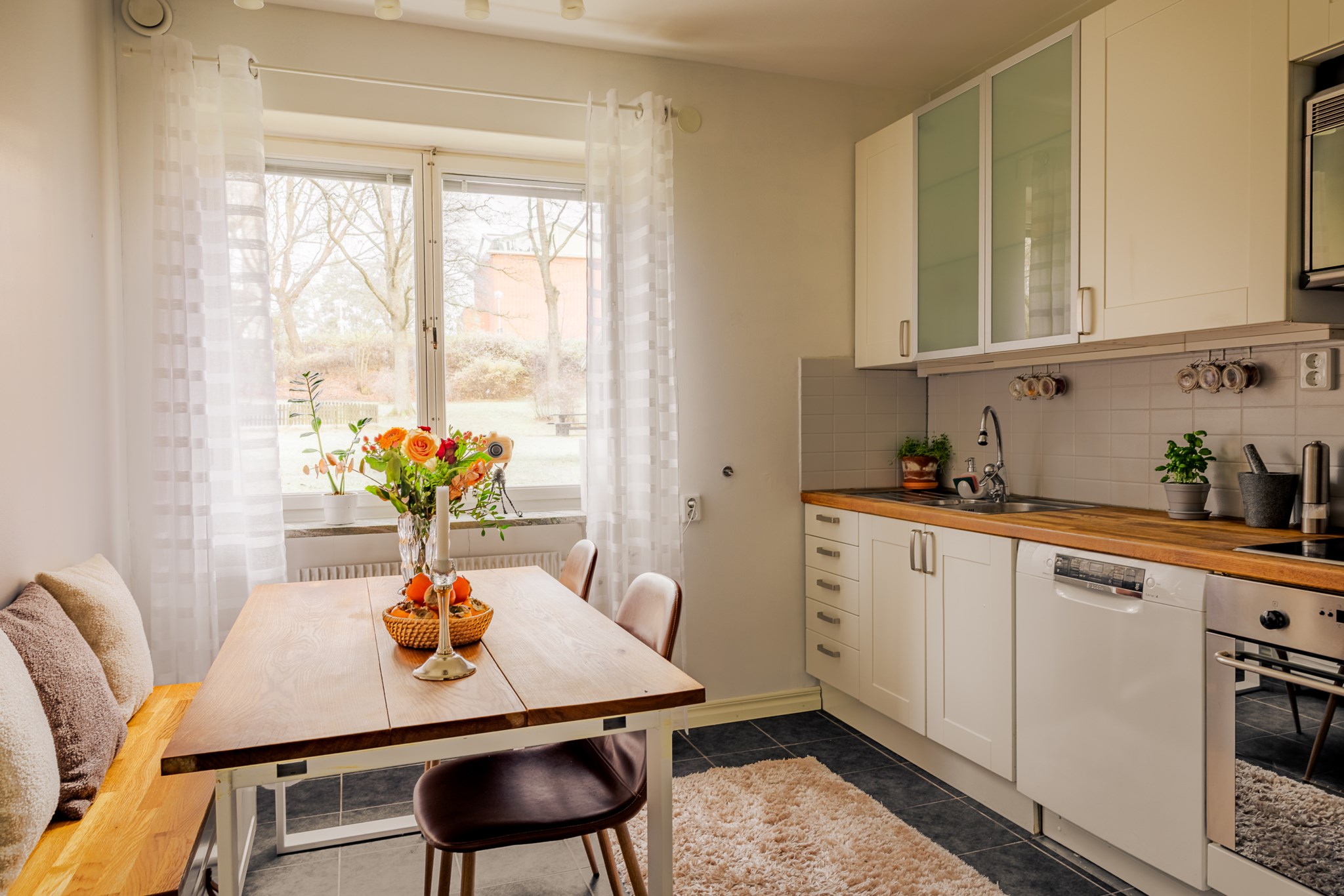 Bostaden är varsamt nymålad och badrummet stambytt redan 2004, vilket ger en trygg och välvårdad känsla. Köket är modernt och ljust, med gott om arbetsytor och förvaring bakom vita skåpsluckor. Den ljusgrå kakelraden lyfter helheten och fångar upp nyanserna i det mörkare golvet och de rostfria vitvarorna. Intill fönstret finns plats för ett större matbord där ni kan sitta med utsikt över grönskan. Sovrummet ligger mot den rofyllda baksidan och rymmer både säng, nattduksbord och god förvaring i garderoberna längs ena väggen. Den vackra trägolven och de ljusa väggarna skapar en harmonisk och inbjudande atmosfär som gör rummet lätt att tycka om. I anslutning till hallen finns också en rymlig klädkammare som både håller ordning och ger plats åt sådant som annars är svårt att förvara. Hallen är välkomnande, med bra avhängningsmöjligheter samt en stor garderob med stilrena skjutdörrar. Härifrån når ni även det helkaklade badrummet med dusch och vikbara väggar, tvättmaskin, handdukstork och spegelskåp.
