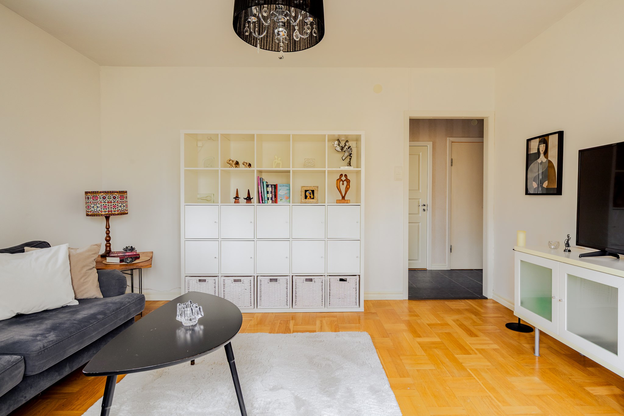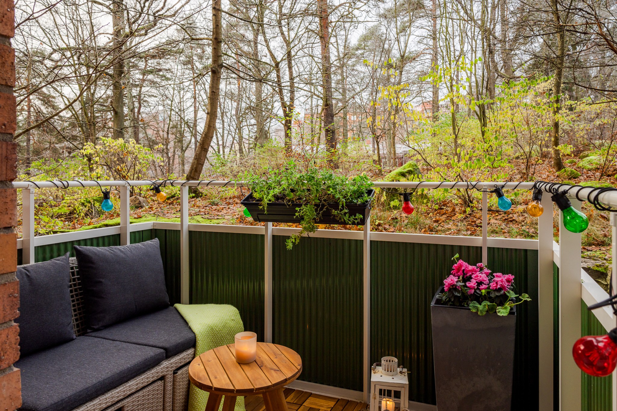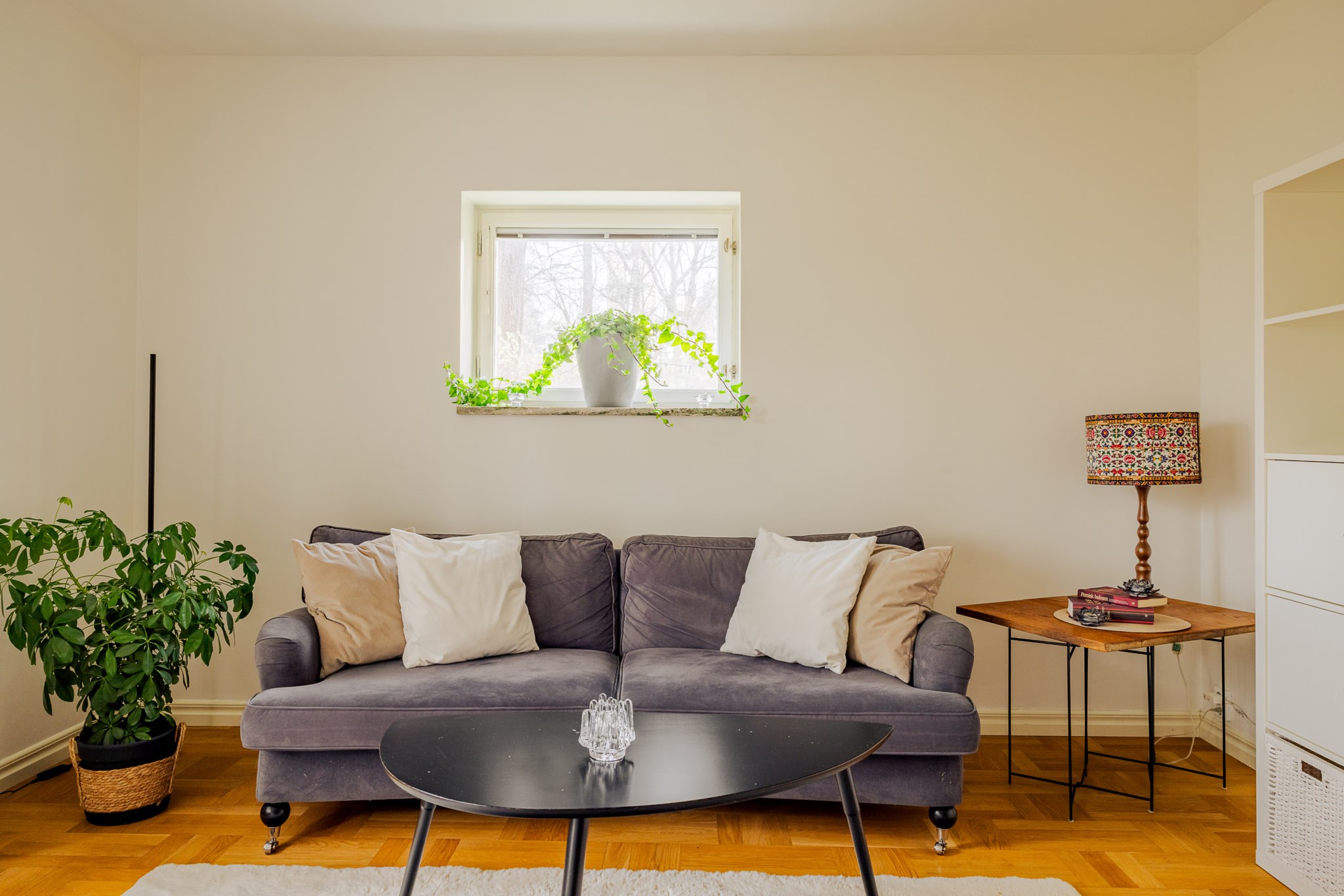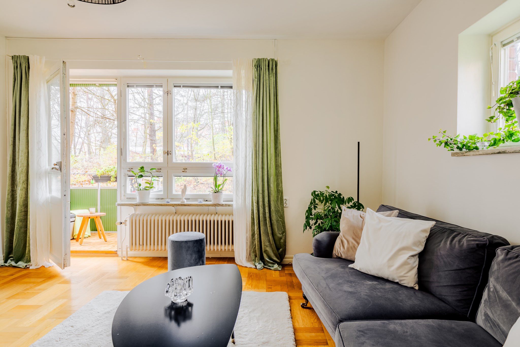 Varmt välkomna till denna trivsamma gaveltvåa mitt i hjärtat av Gamla Råsunda, där lugnet möter ett av Solnas mest populära och charmiga kvarter. Här bor ni på en stillsam gata med grönområden alldeles intill och kommunikationer som tar er vidare till city, arenor och grannstadsdelar på bara några minuter. Huset är uppfört 1948 och förvaltas omsorgsfullt, något som märks redan när man kliver in genom porten. Lägenheten är smart planerad med ett vardagsrum som bjuder på fint parkettgolv, ljusa väggar och fönster i två väderstreck som släpper in ett mjukt och naturligt ljus över hela rummet. Härifrån blickar ni ut över den lugna baksidan där grönskan skapar ett avskilt och ostört läge – en ovanlig kombination i ett så centralt område. Från vardagsrummet kliver ni ut på balkongen som renoverades 2024 och som enkelt blir ert privata sommarhäng, med plats för både matbord, stolar och blomlådor. Här är det lätt att skapa en egen liten oas som snabbt blir favoritplatsen under årets ljusa månader.