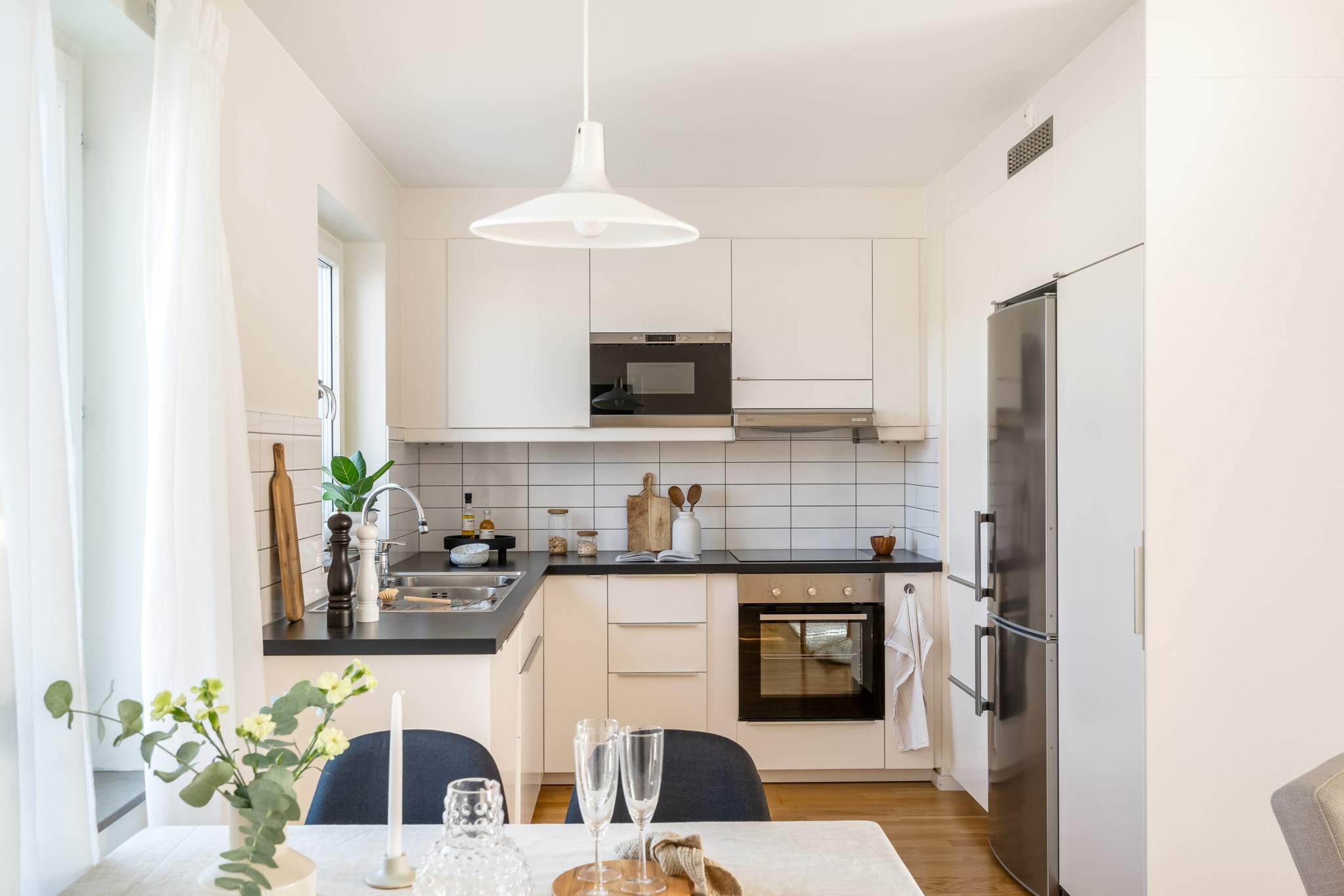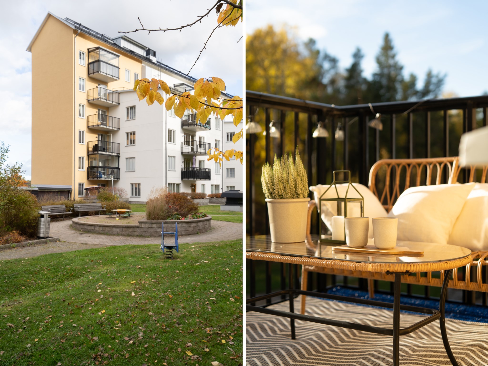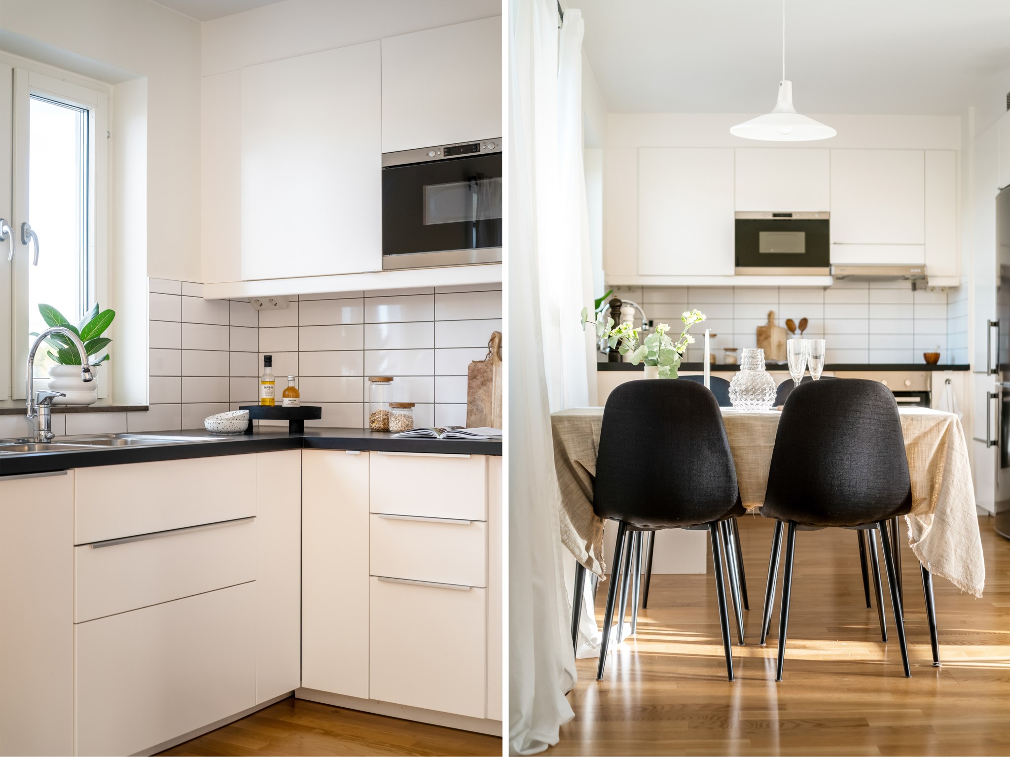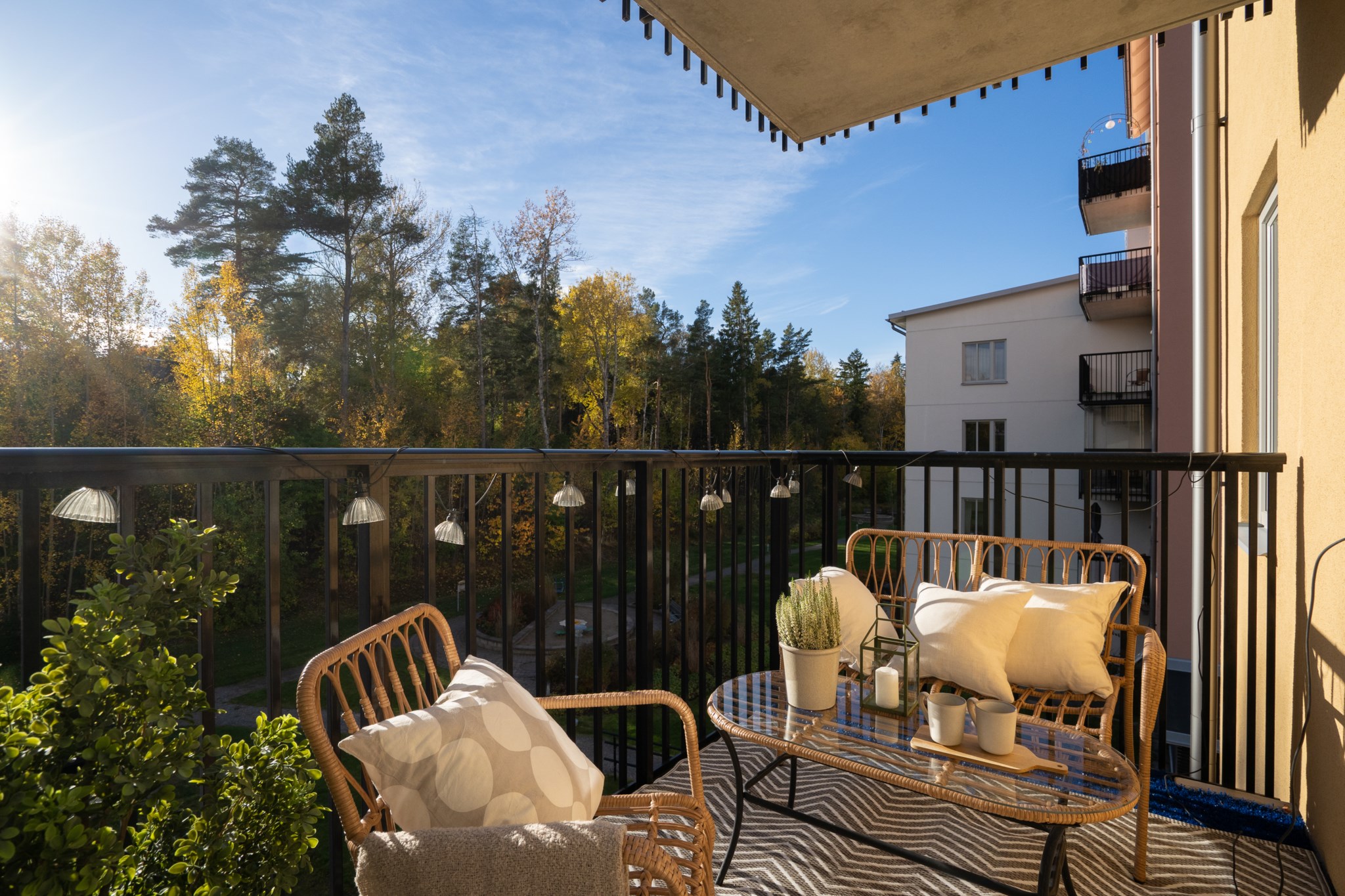 Köket är fullt utrustat med moderna vitvaror och erbjuder gott om arbetsyta för dig som gillar att laga mat. Från vardagsrummet når du den soldränkta balkongen med utsikt mot grönskande träd och föreningens lugna innergård – en naturlig plats för morgonkaffe, middagar eller kvällssol.