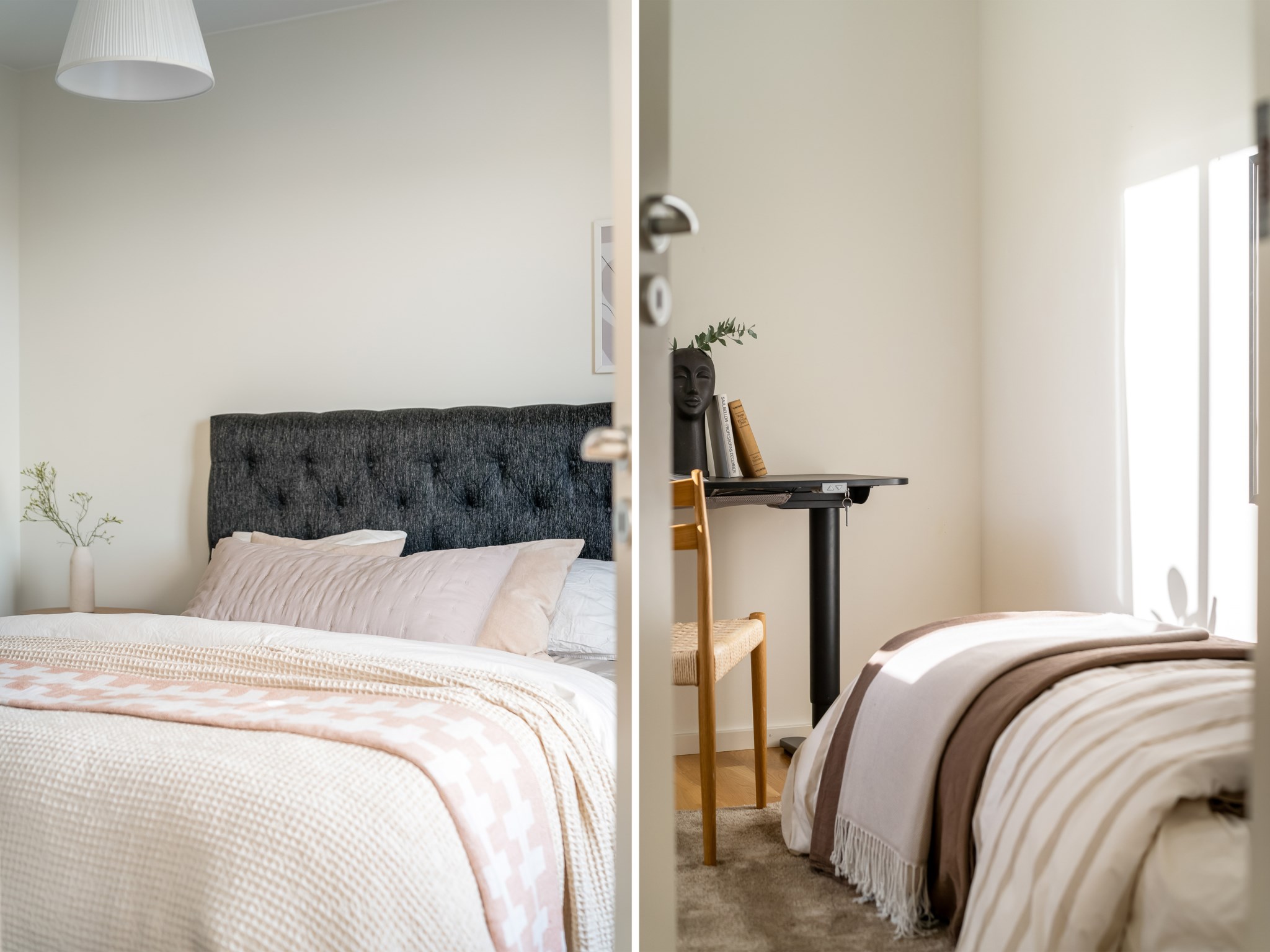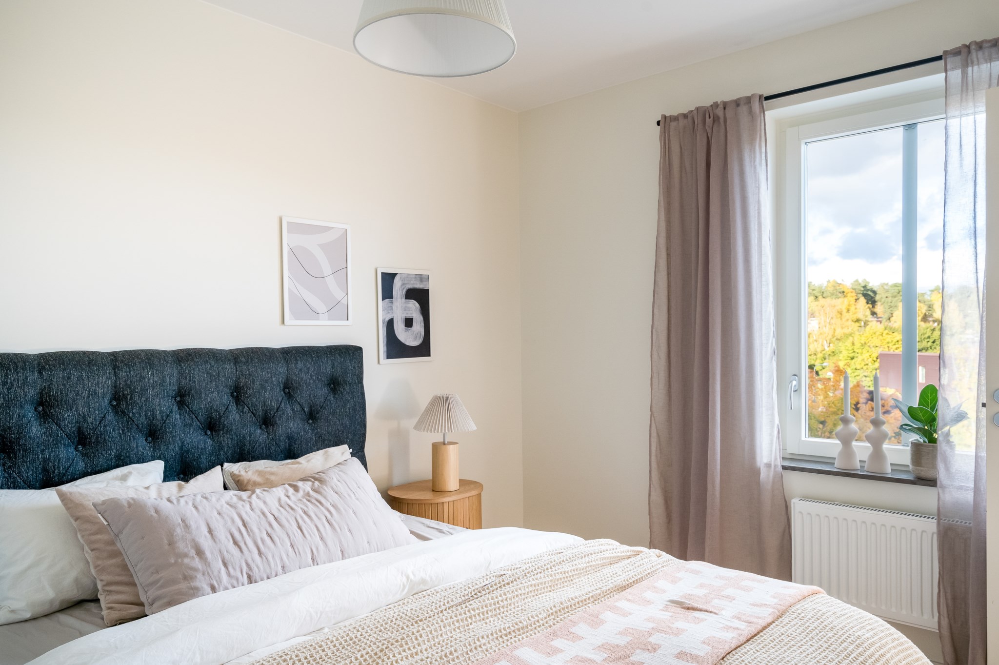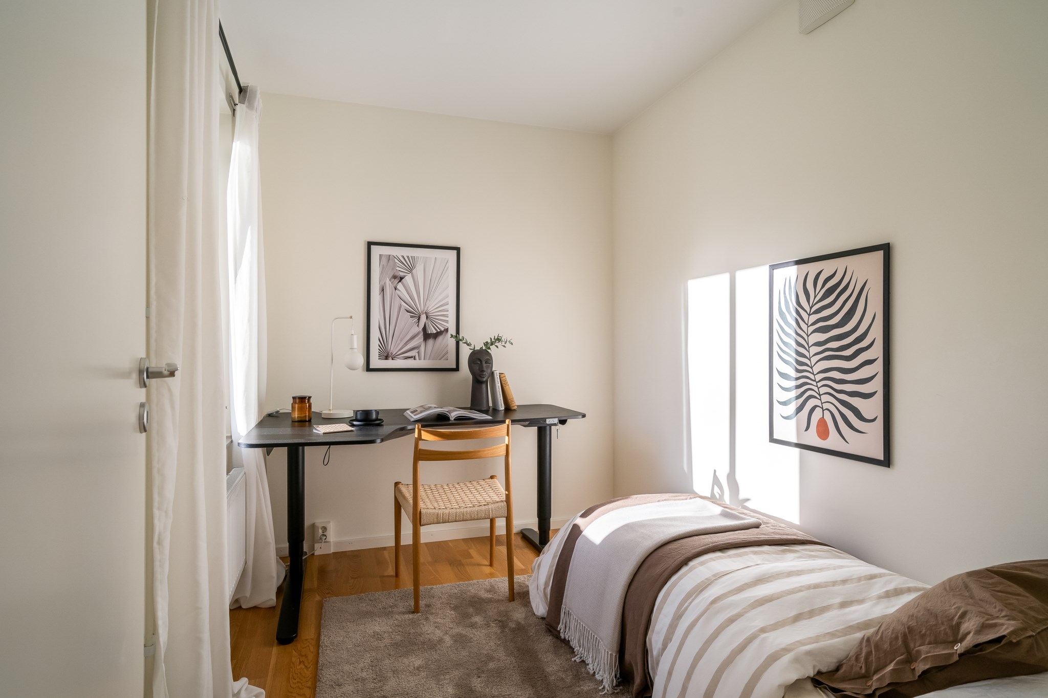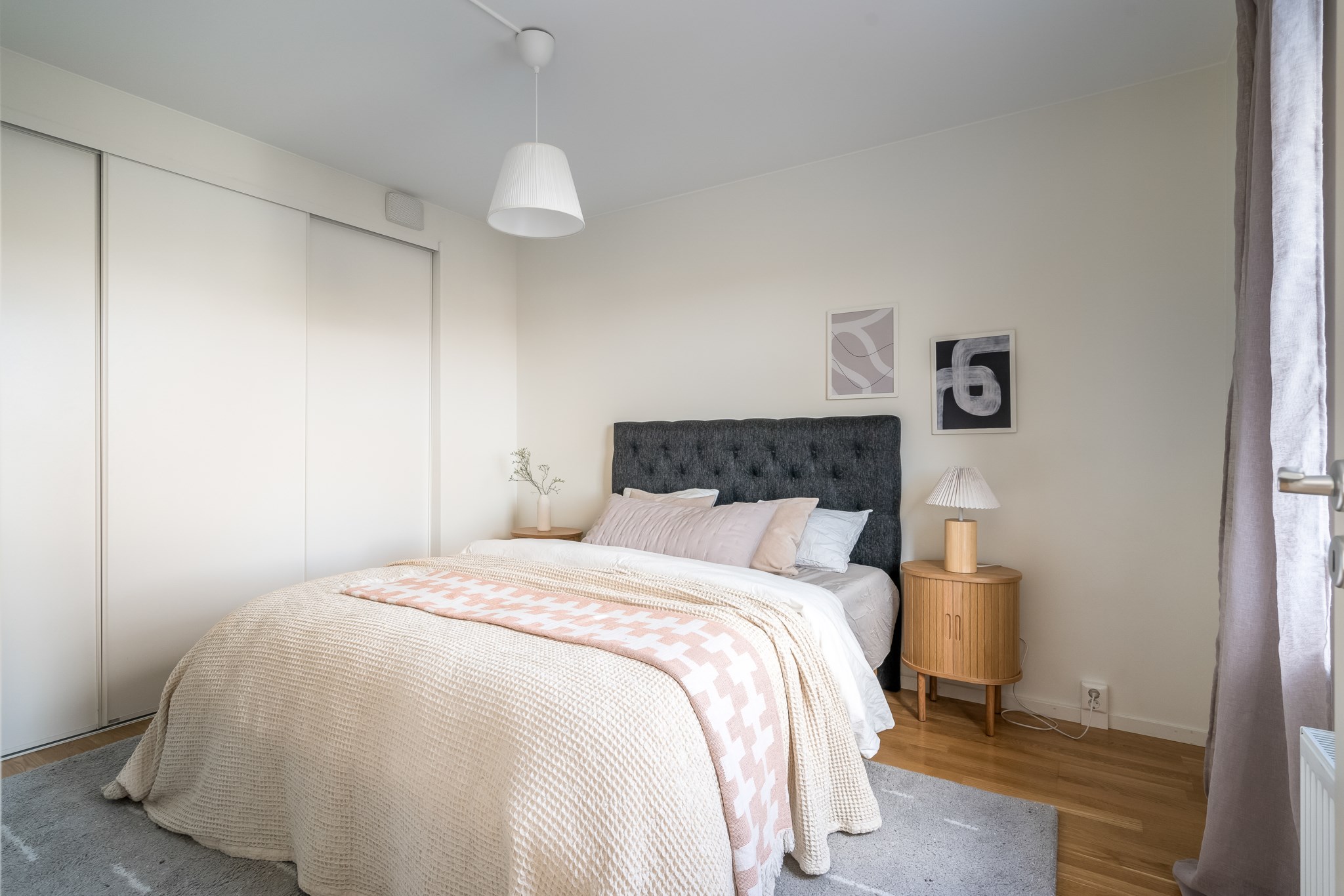 Lägenheten har två rogivande sovrum, varav det ena med garderober längs hela väggen för generös förvaring. Det stilrena badrummet är helkaklat och utrustat med dusch, wc, kommod och spegelskåp – genomgående smakfullt och lättskött.