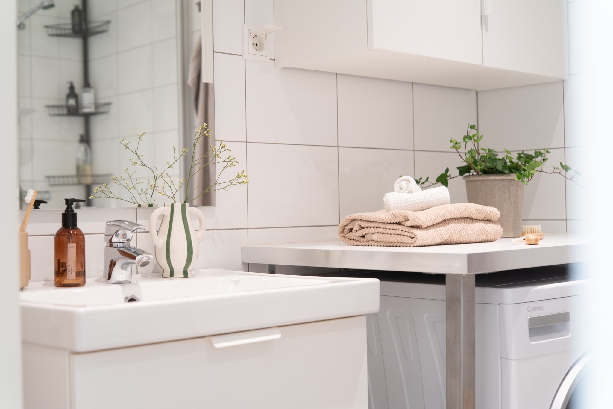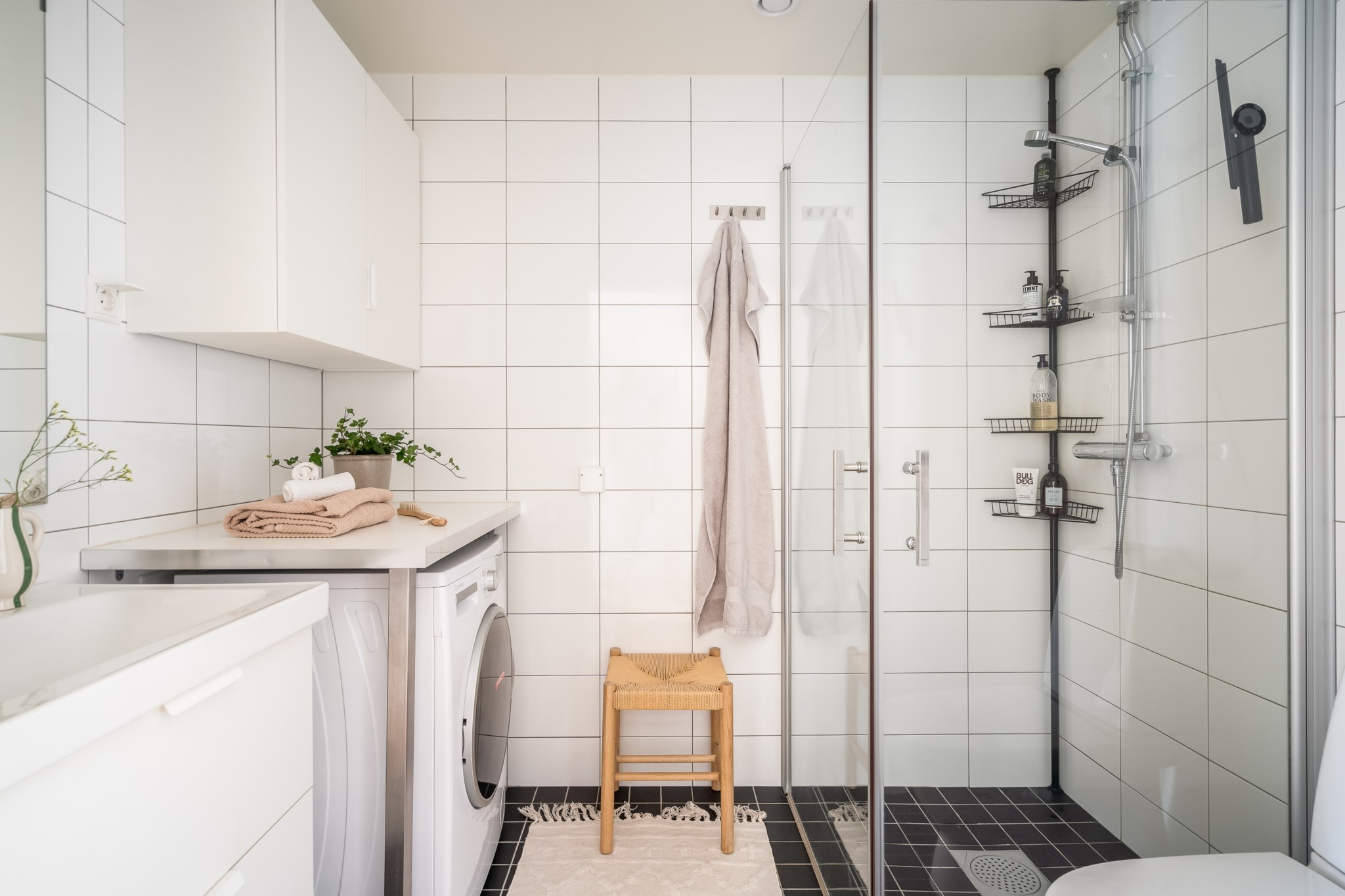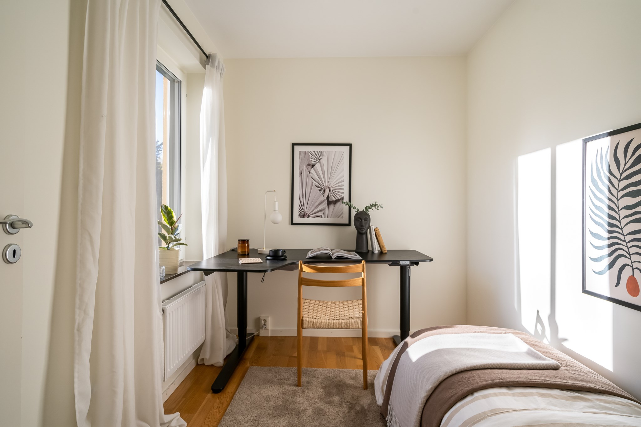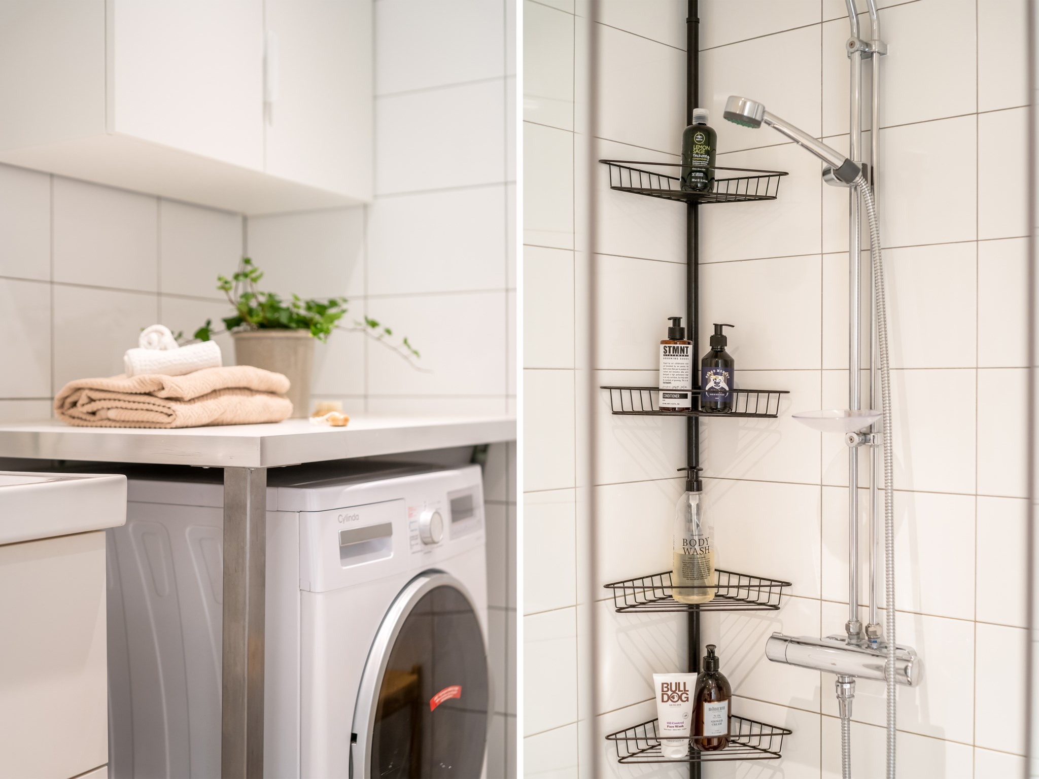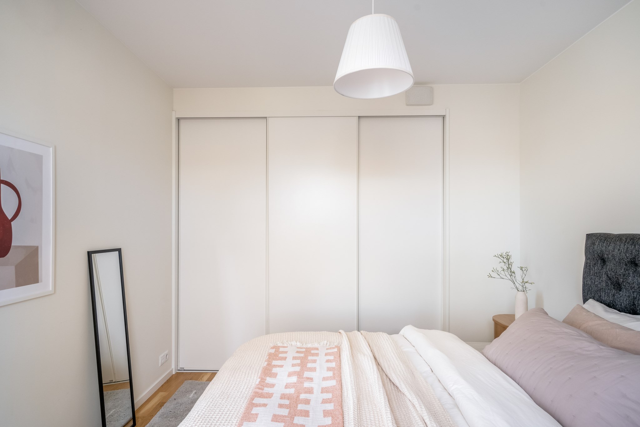 Lägenheten har två rogivande sovrum, varav det ena med garderober längs hela väggen för generös förvaring. Det stilrena badrummet är helkaklat och utrustat med dusch, wc, kommod och spegelskåp – genomgående smakfullt och lättskött.