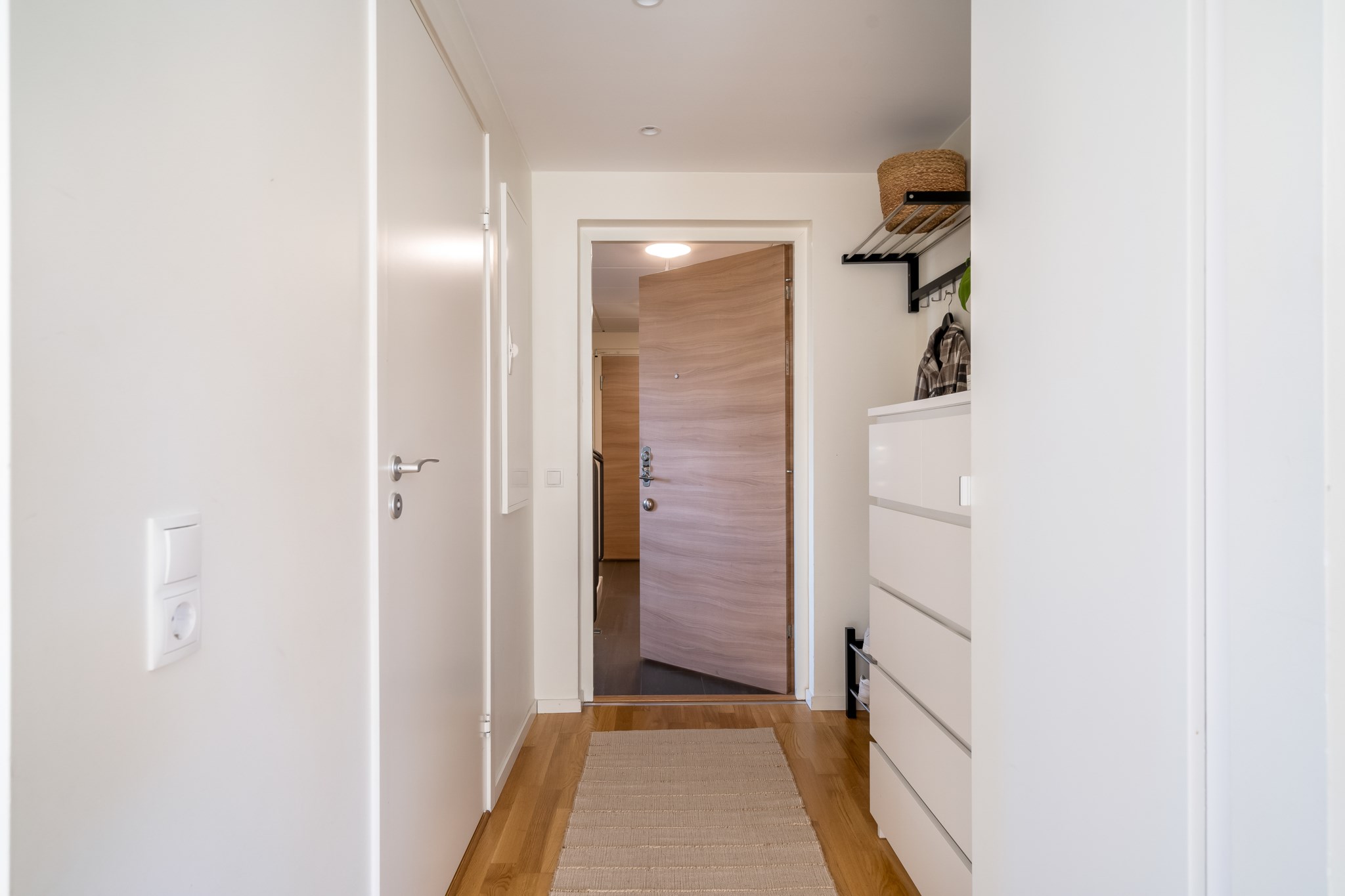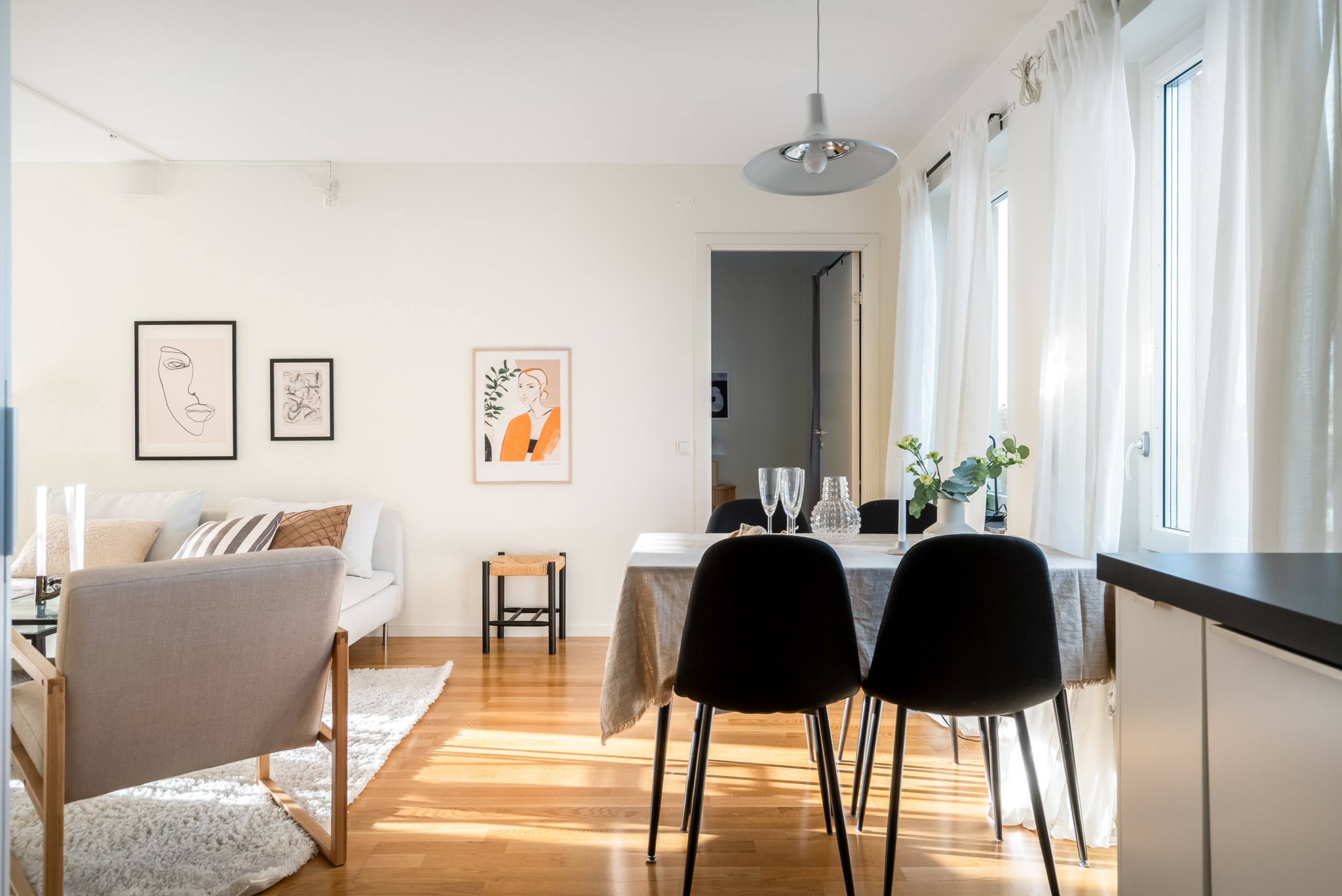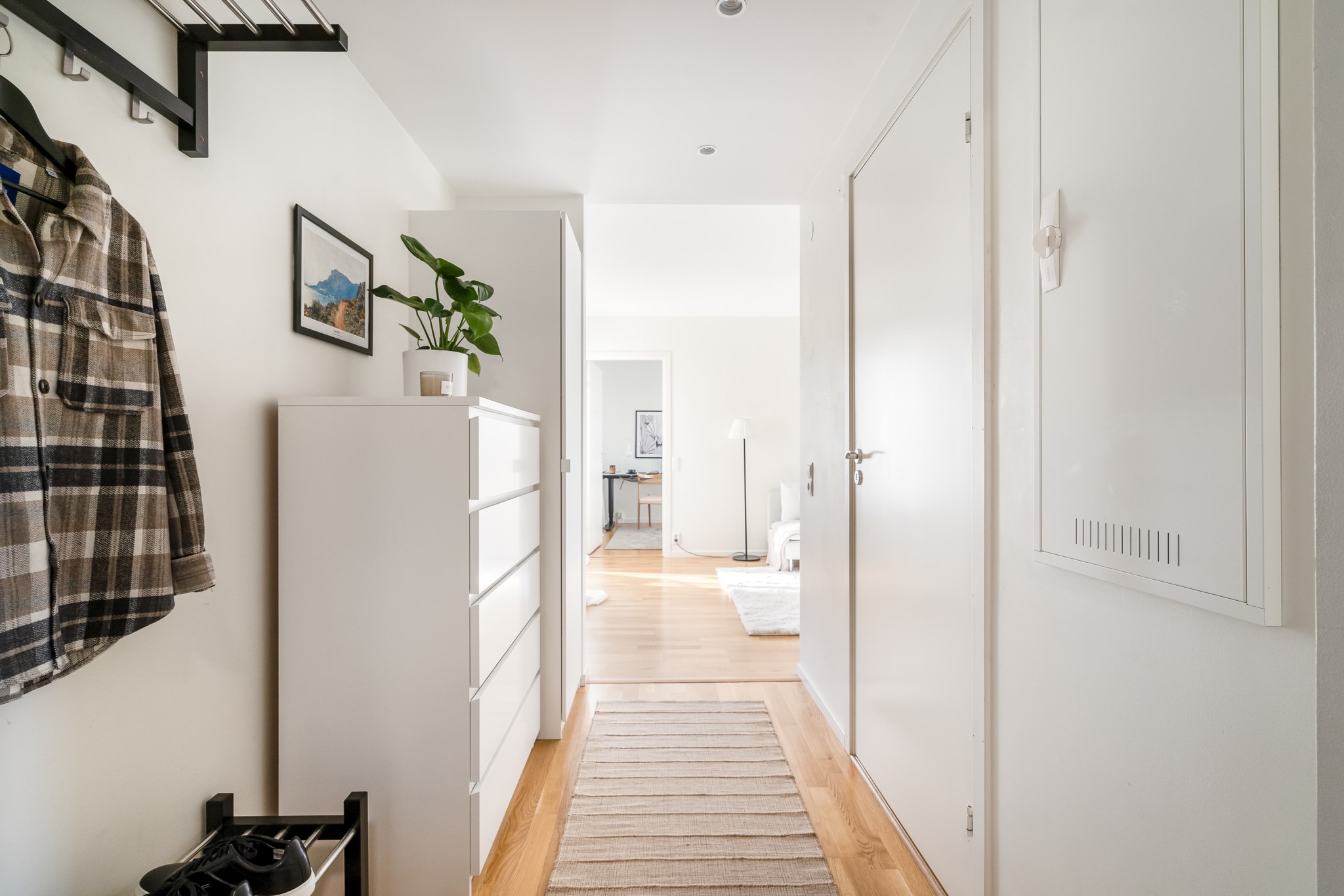Redan i hallen möts du av en välkomnande atmosfär med plats för avhängning och möblering. Härifrån öppnar sig det ljusa vardagsrummet med öppen planlösning mot matplats och kök, vilket skapar en social och inbjudande miljö – perfekt för både vardag och umgänge.