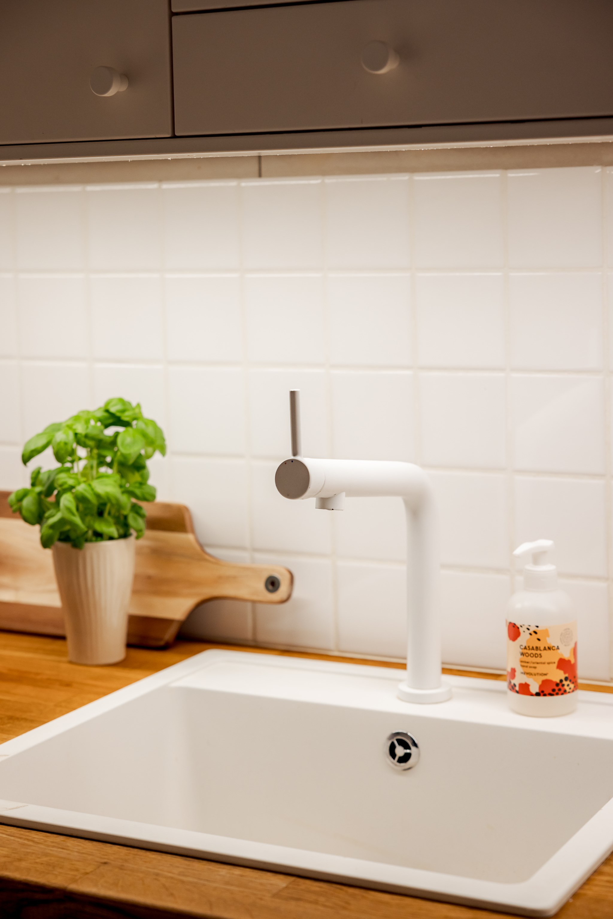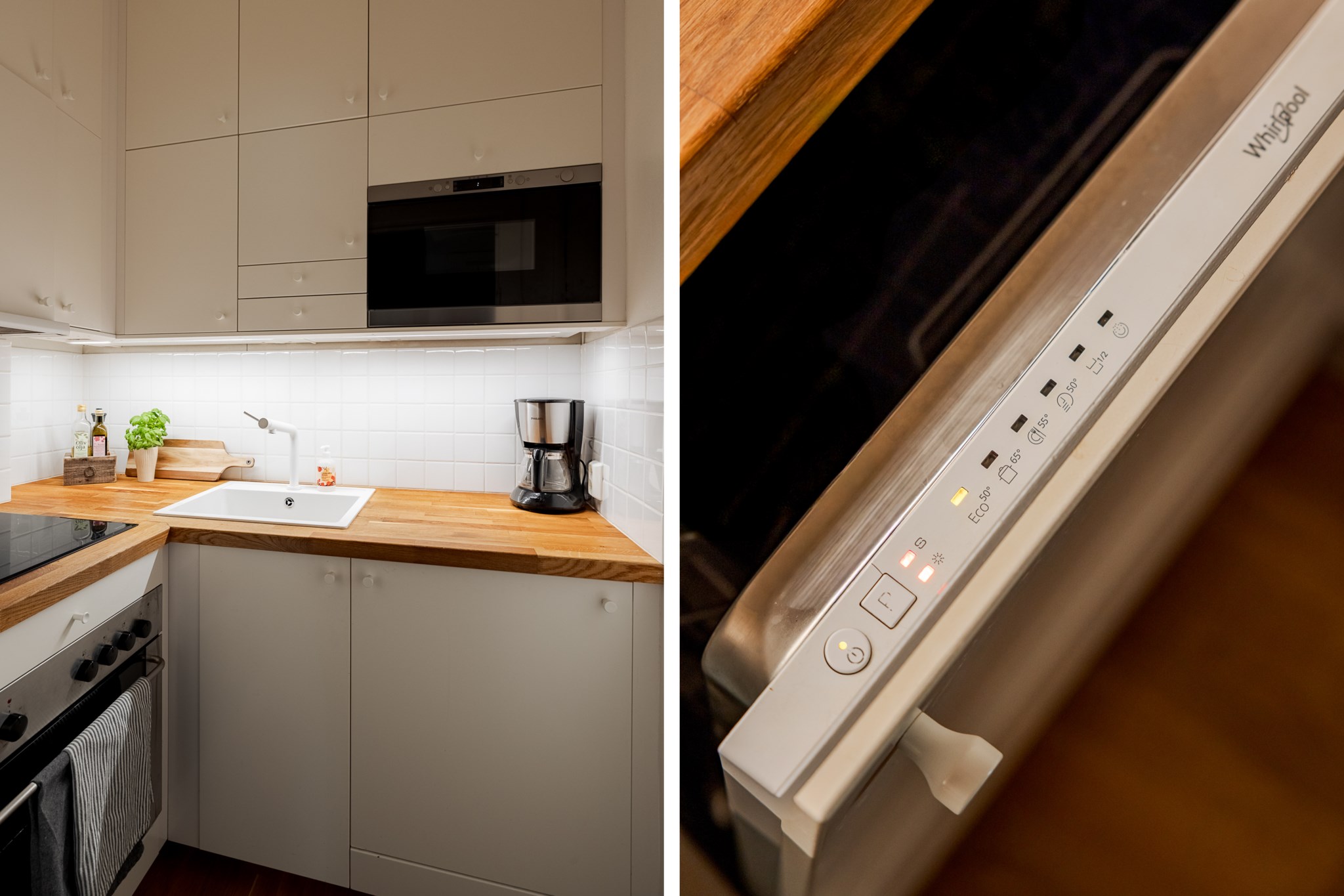 Köket är stilrent och effektivt planerat, utrustat med kvalitativa vitvaror – diskmaskin, ugn, mikro – och gott om förvaring samt arbetsytor för dig som gillar att laga mat eller bjuda in till middagar.