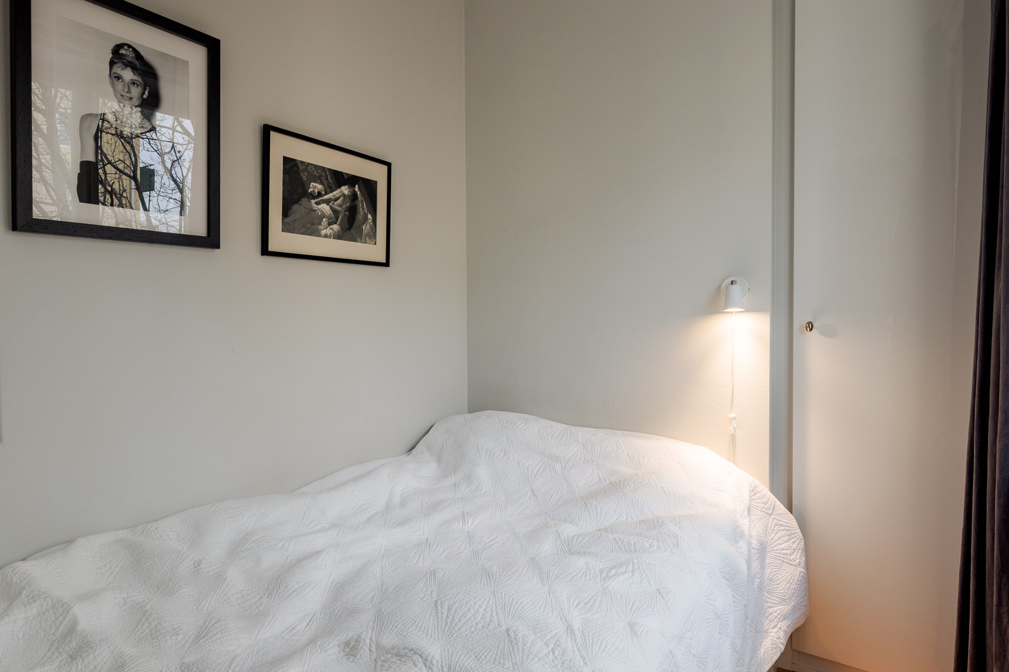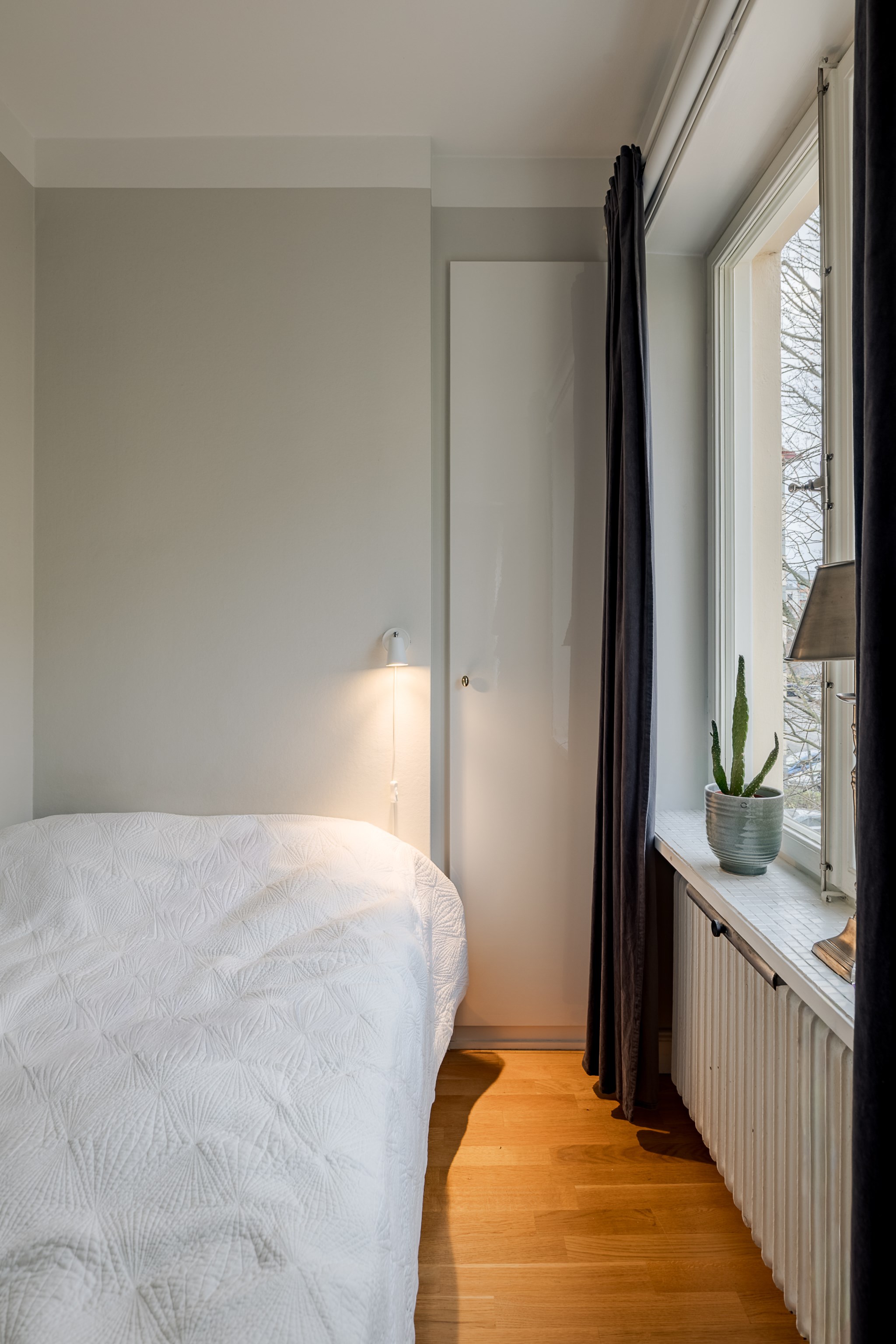 Sovrummet erbjuder en lugn och avkopplande atmosfär med plats för säng och garderob. Det helkaklade badrummet är både elegant och praktiskt, med golvvärme, handdukstork, duschhörna och tvättmaskin – detaljer som förhöjer vardagen.