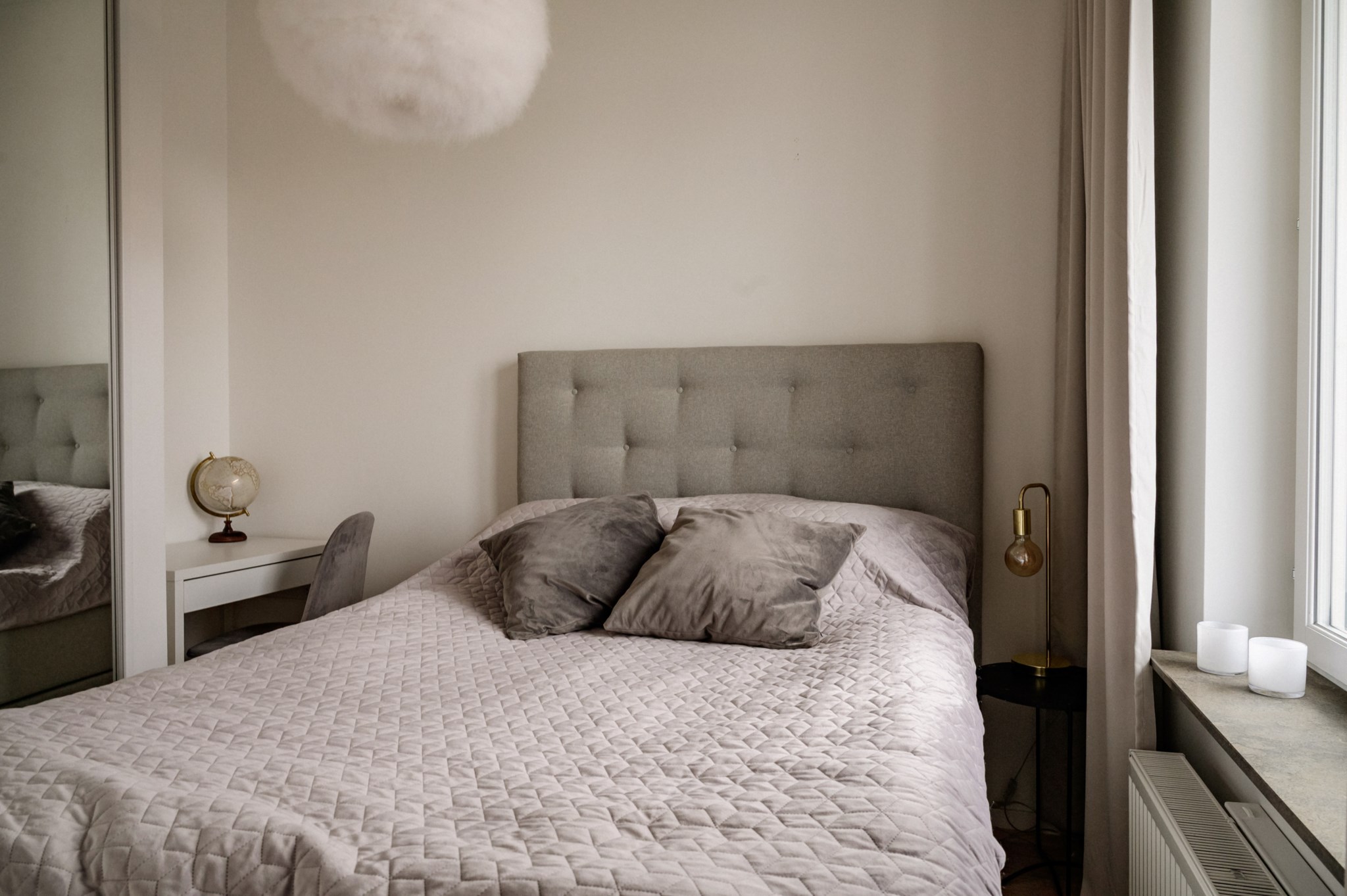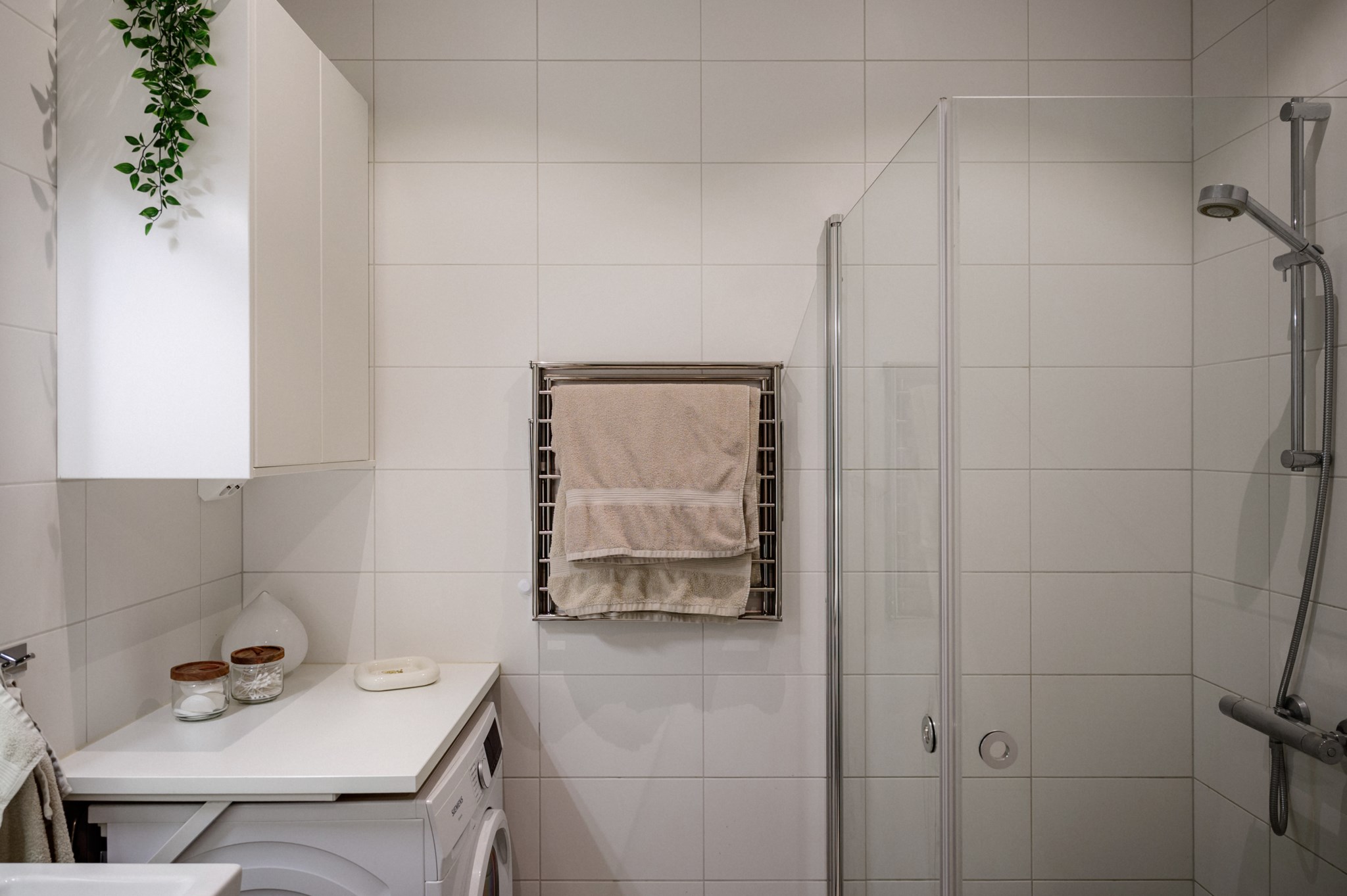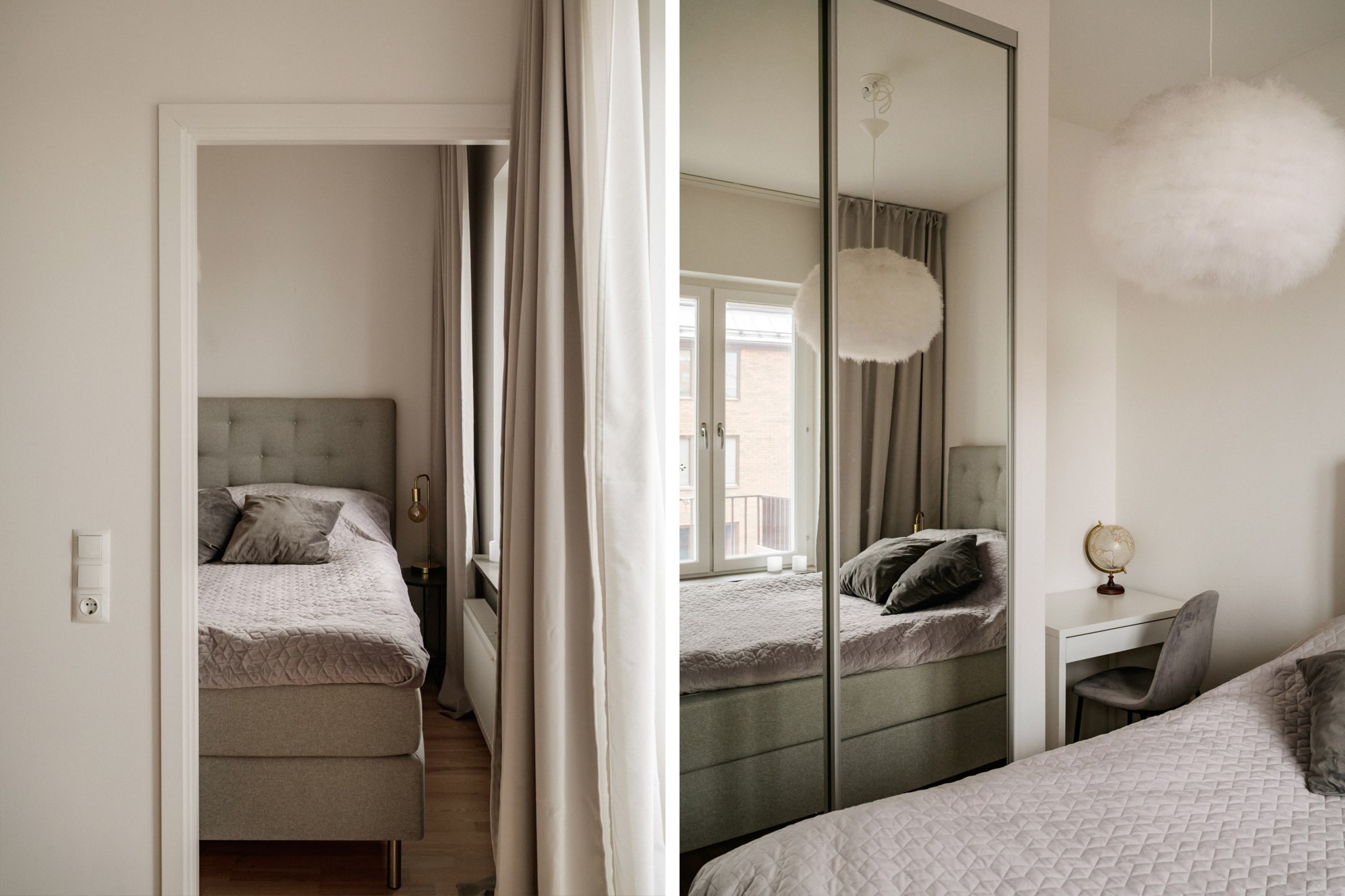 Sovrummet är avskilt, välproportionerat och utrustat med skjutdörrsgarderober med spegel som både löser förvaringen och förstärker känslan av rymd. Badrummet håller samma höga nivå som resten av bostaden, med helkaklade väggar, smart tvättdel och en stilren, modern hotellkänsla.