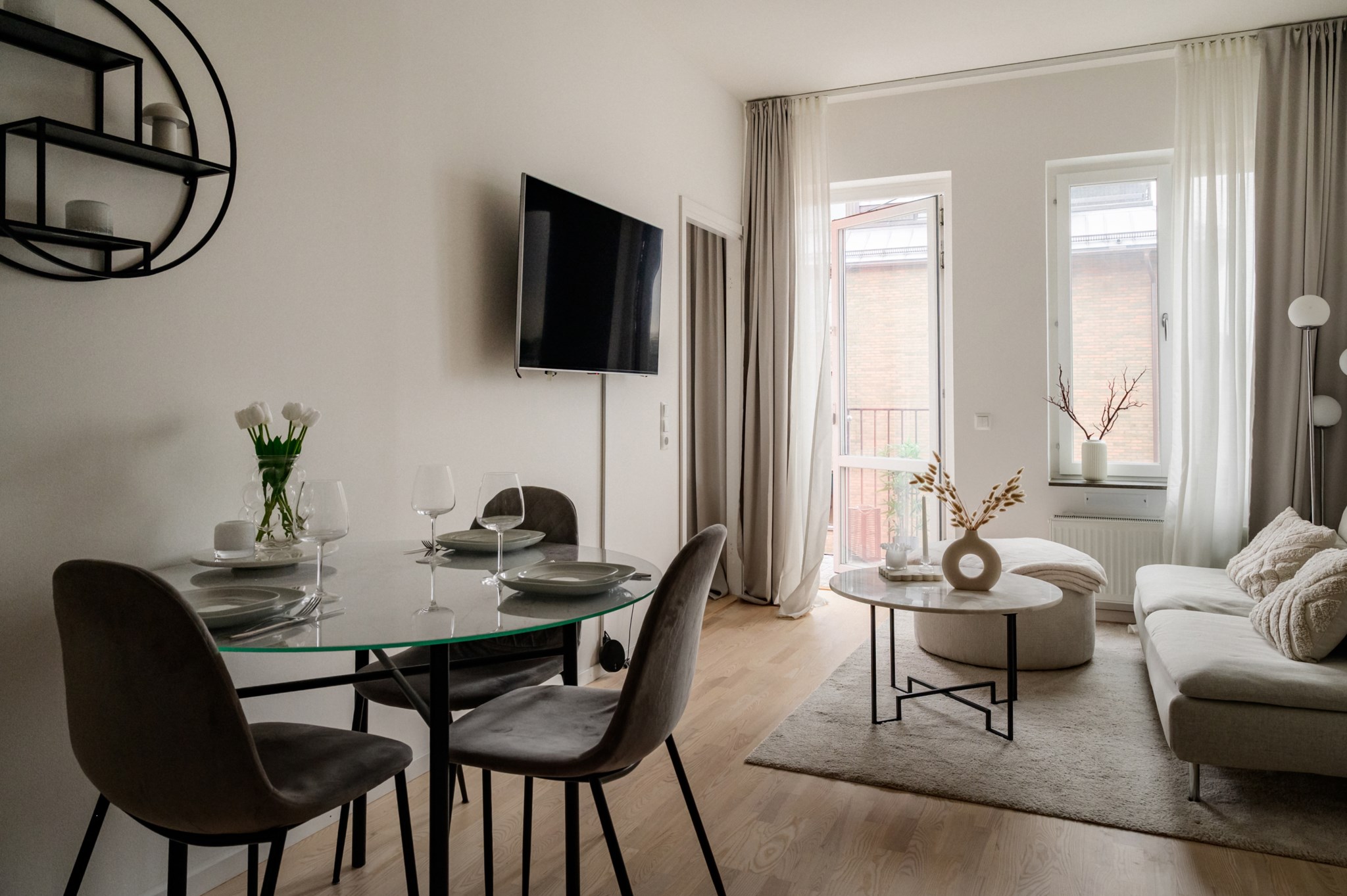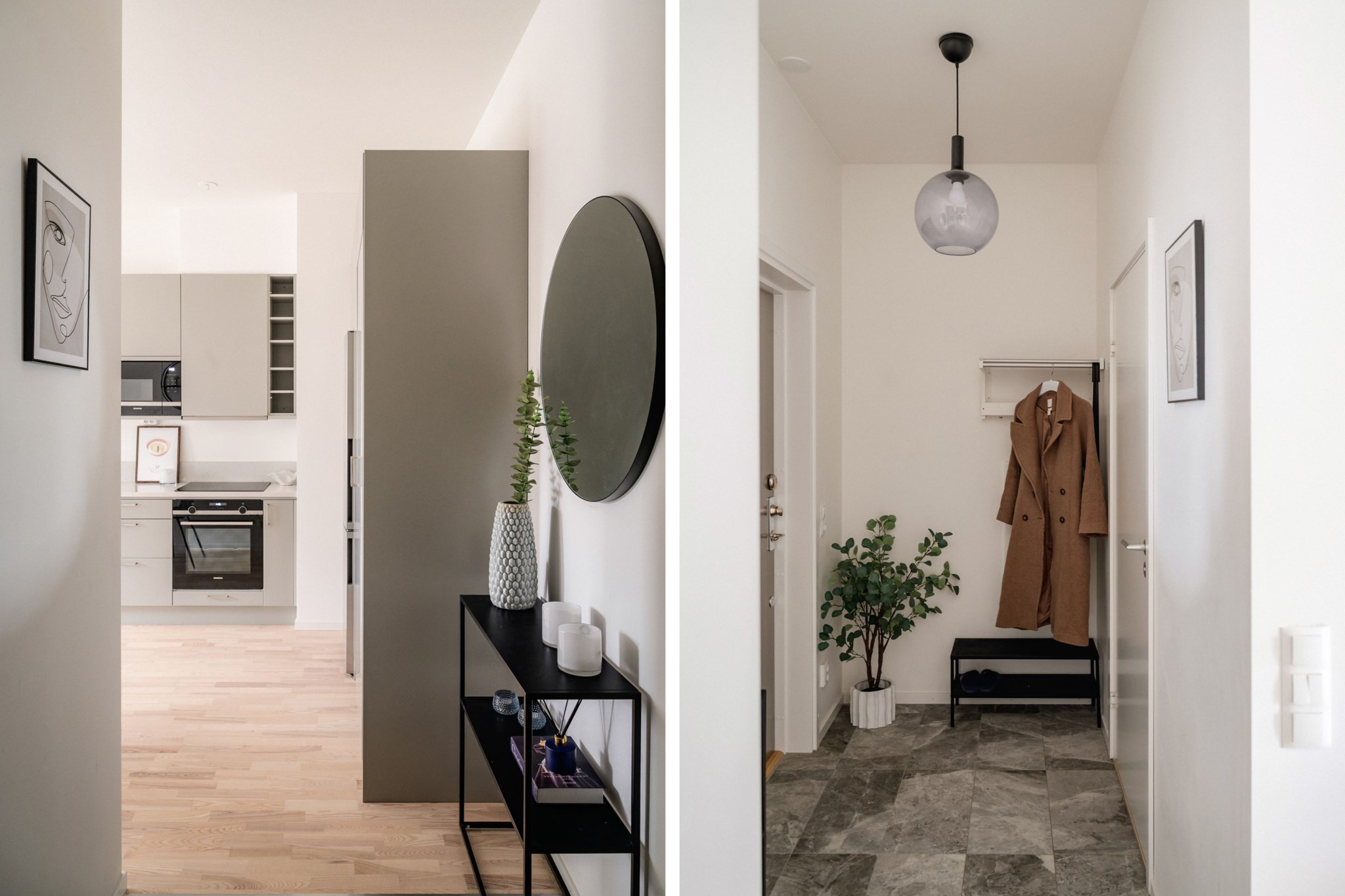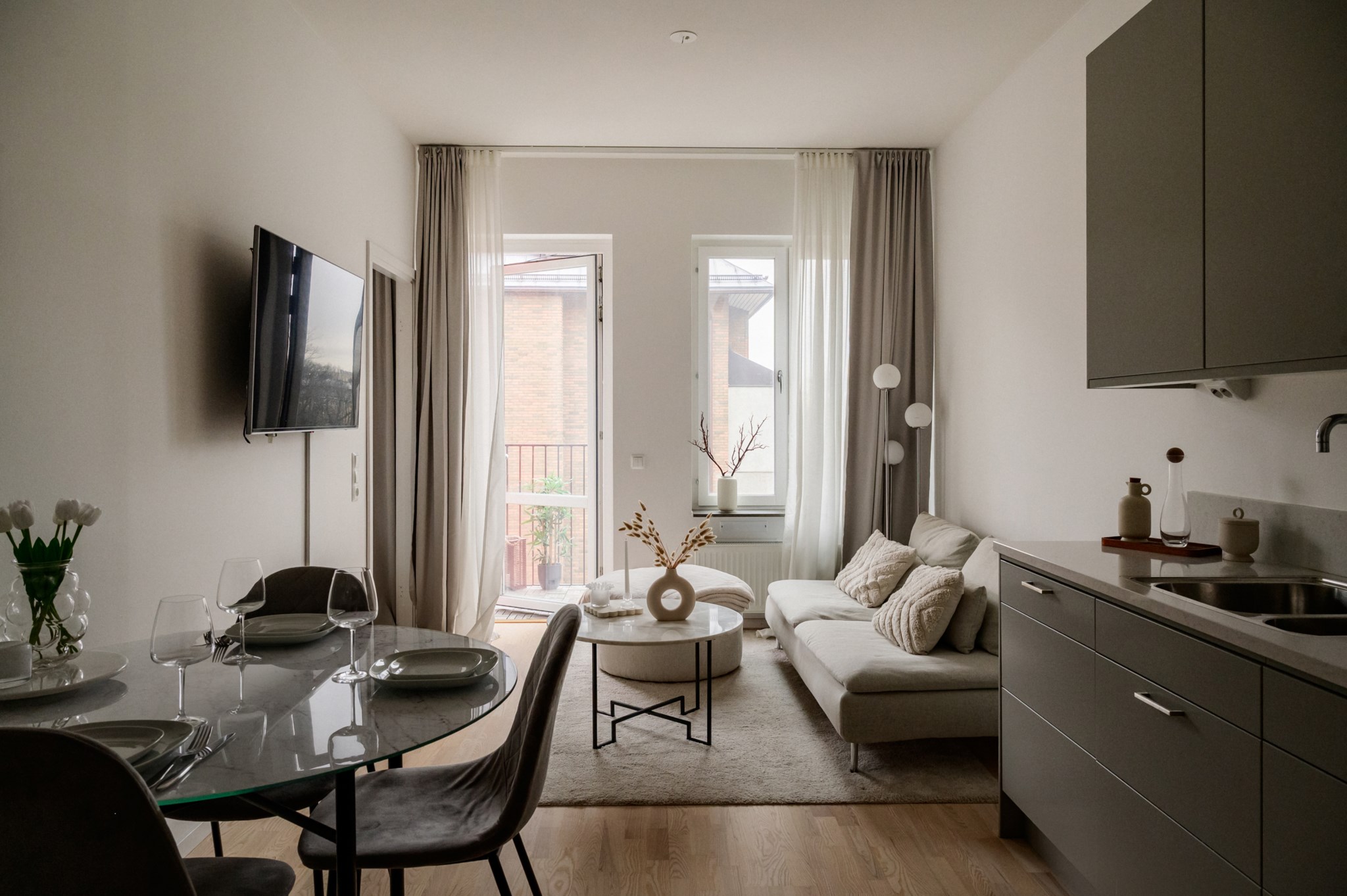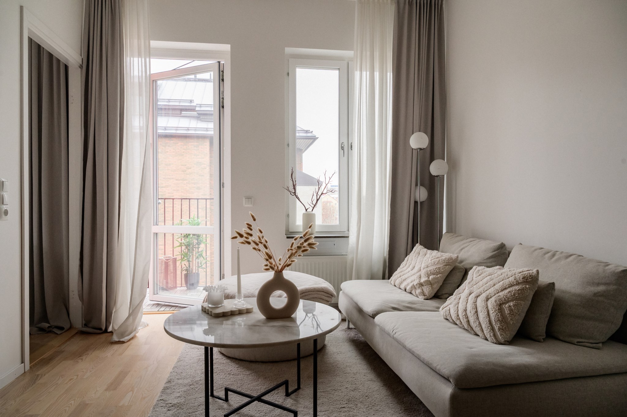 På Östervägen 28 B väntar en av BRF Råsunda 101:s mest unika bostäder – en genomtänkt och exklusivt utformad tvåa om 34 kvm belägen högt upp på våning 5. Redan vid första steget in möts du av en generös takhöjd som inte är standard i huset och som direkt skapar en känsla av rymd, ljus och elegans. Här har man inte nöjt sig med basnivån – lägenheten är utförd med påkostade materialval och en harmonisk färgpalett som tillsammans ger ett hem med en tydlig premiumkänsla.
