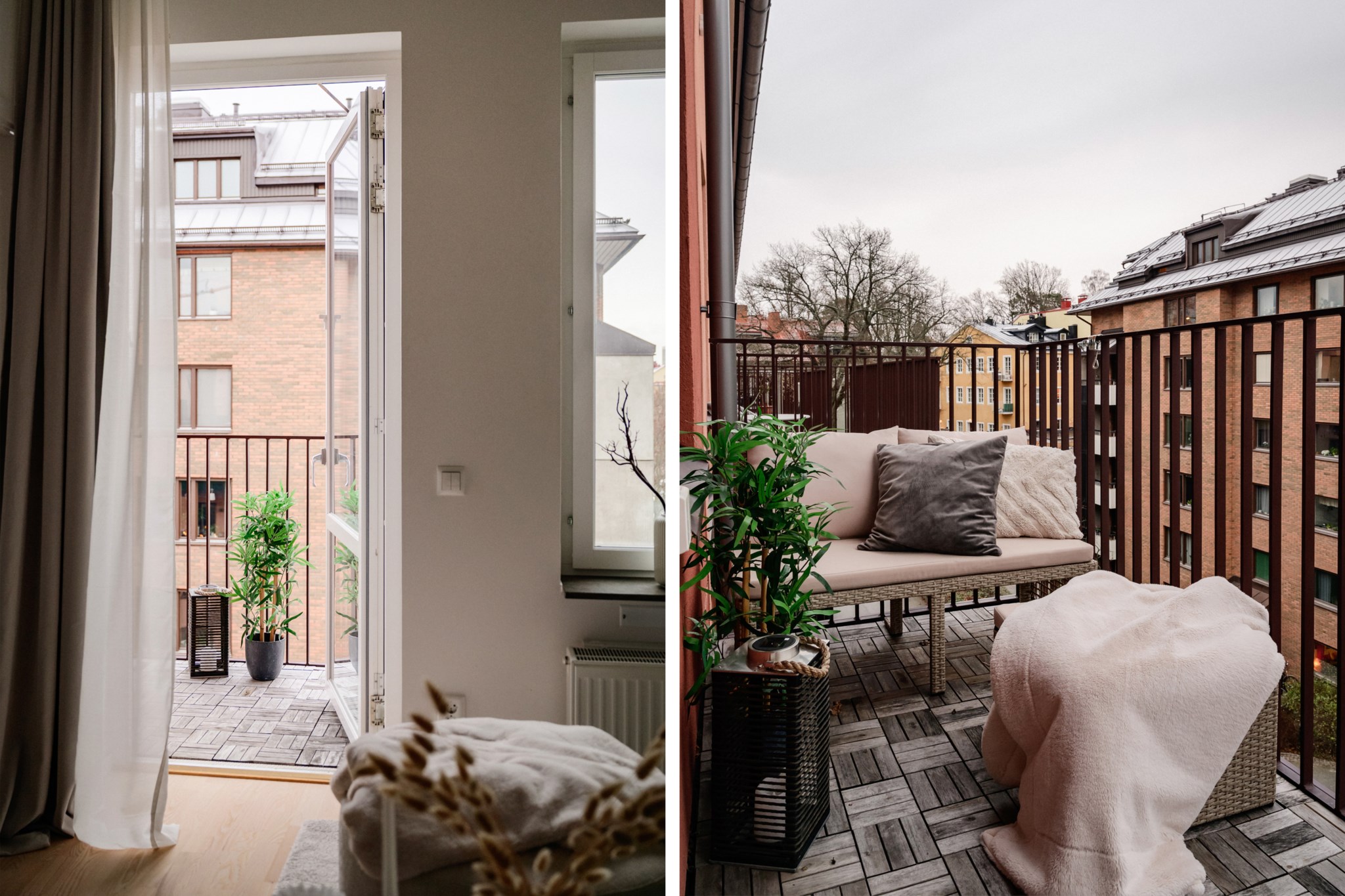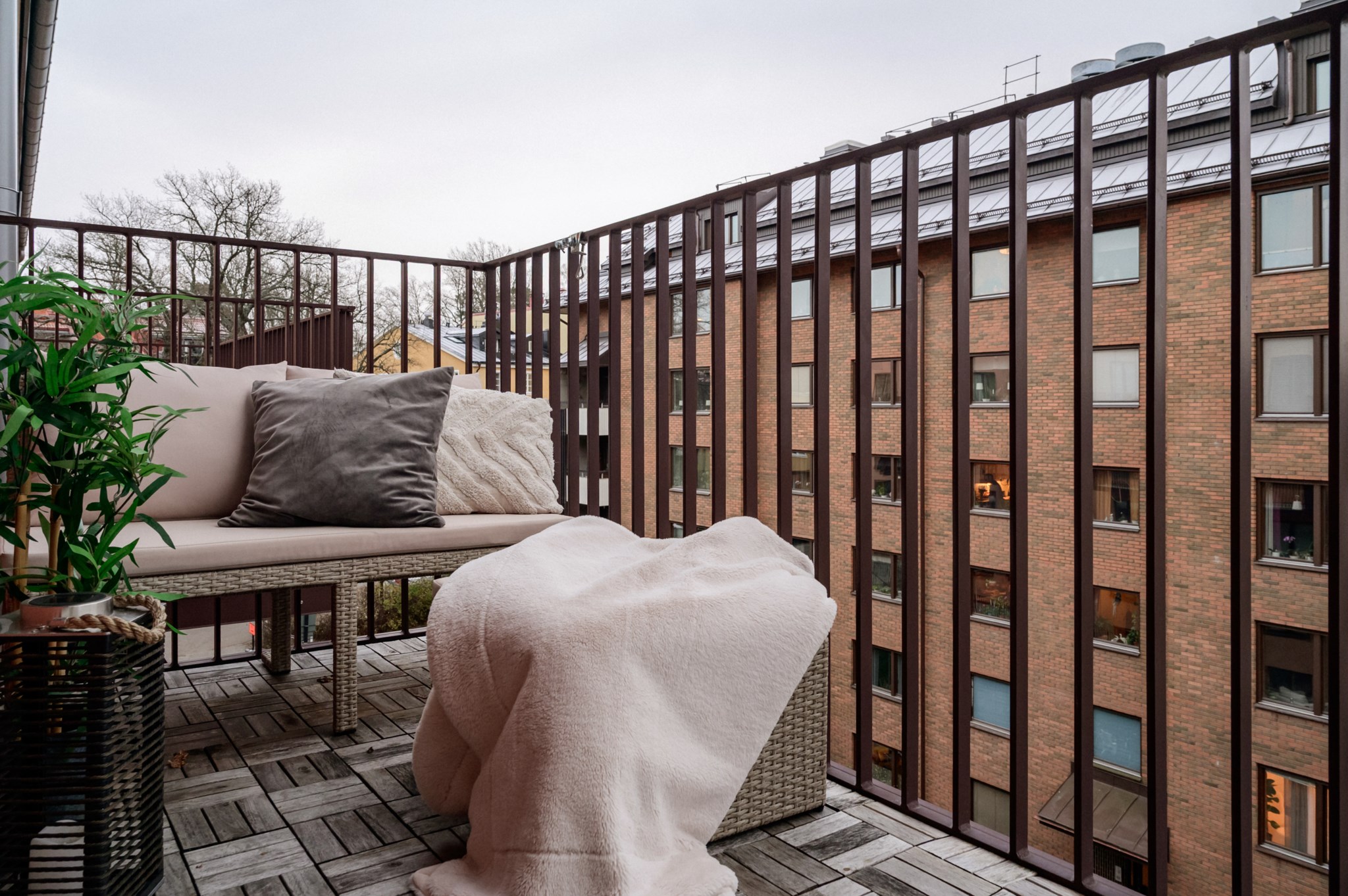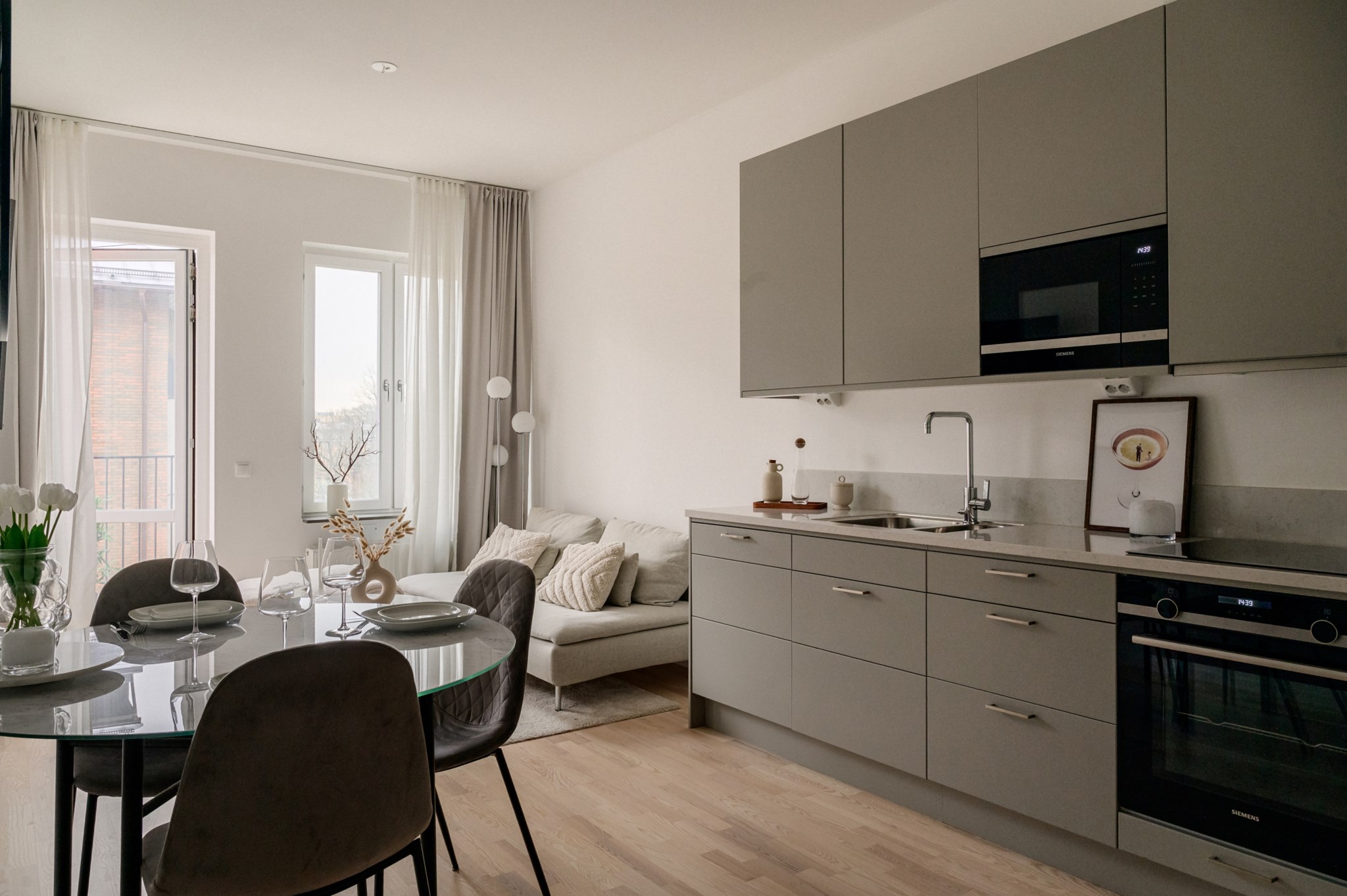 Köket kommer från Ballingslöv och är ett statement i sig. De släta luckorna, integrerade vitvarorna och den vackra arbets- och stänkskivan i komposit binds samman till en sober helhet som känns både stilfull och funktionell. I den öppna planlösningen ryms också en naturlig matplats och ett socialt vardagsrum där stora fönster släpper in ett milt, jämnt ljus. Härifrån nås även den mysiga balkongen – ett perfekt extra rum under årets varmare dagar med utsikt mot det lugna kvarteret.