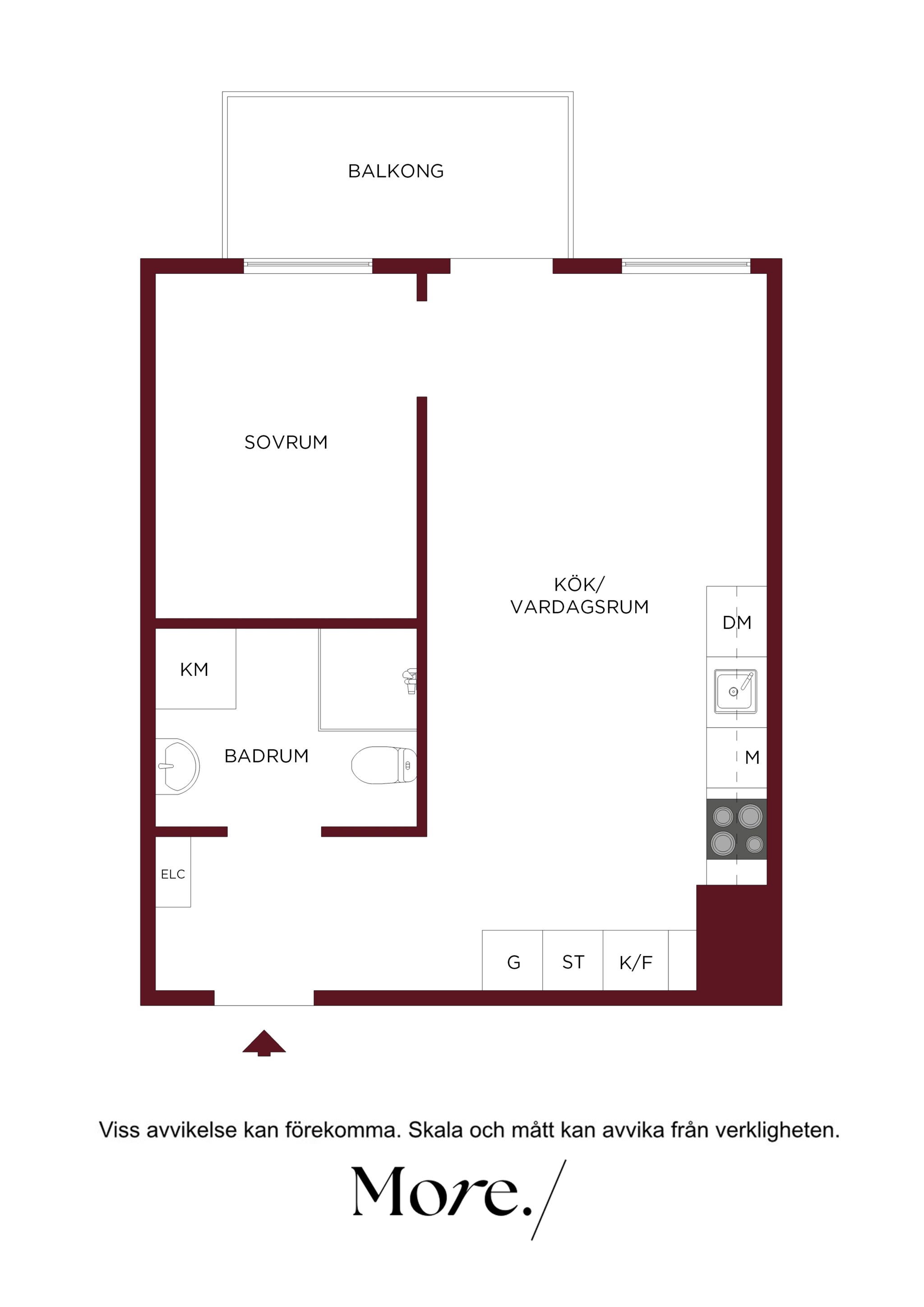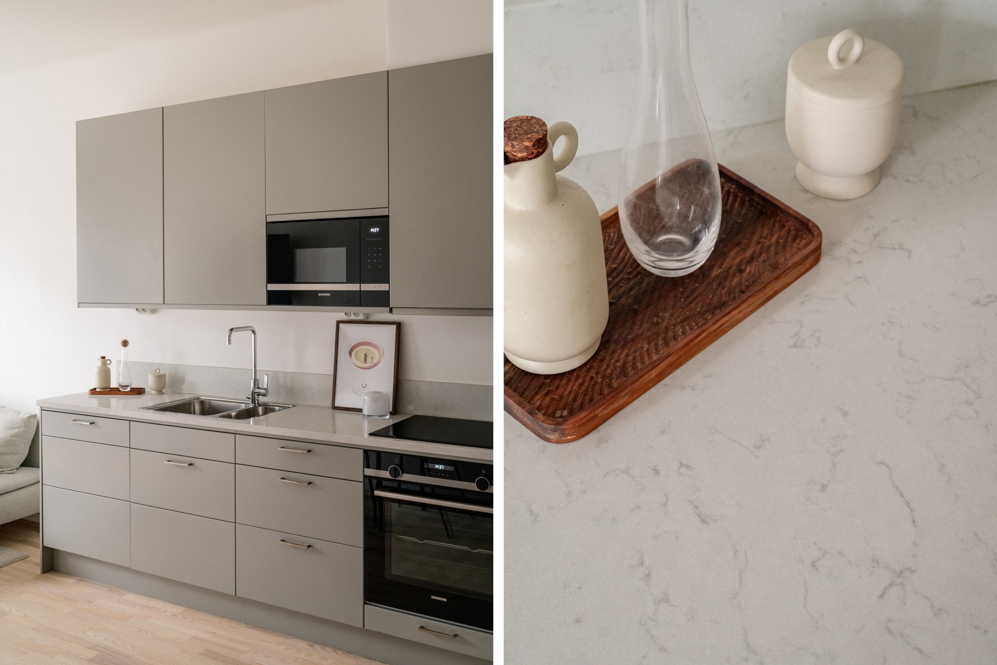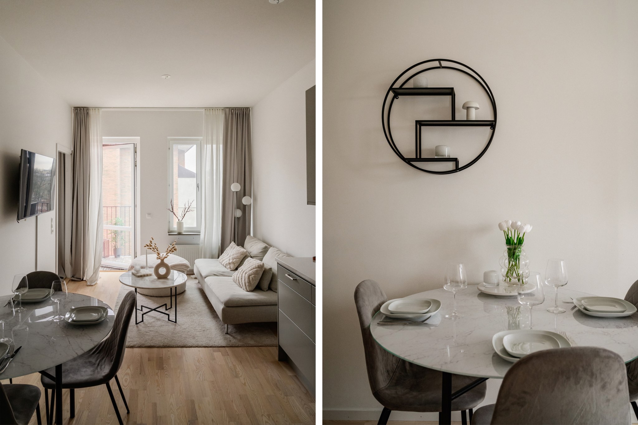 Köket kommer från Ballingslöv och är ett statement i sig. De släta luckorna, integrerade vitvarorna och den vackra arbets- och stänkskivan i komposit binds samman till en sober helhet som känns både stilfull och funktionell. I den öppna planlösningen ryms också en naturlig matplats och ett socialt vardagsrum där stora fönster släpper in ett milt, jämnt ljus. Härifrån nås även den mysiga balkongen – ett perfekt extra rum under årets varmare dagar med utsikt mot det lugna kvarteret.
