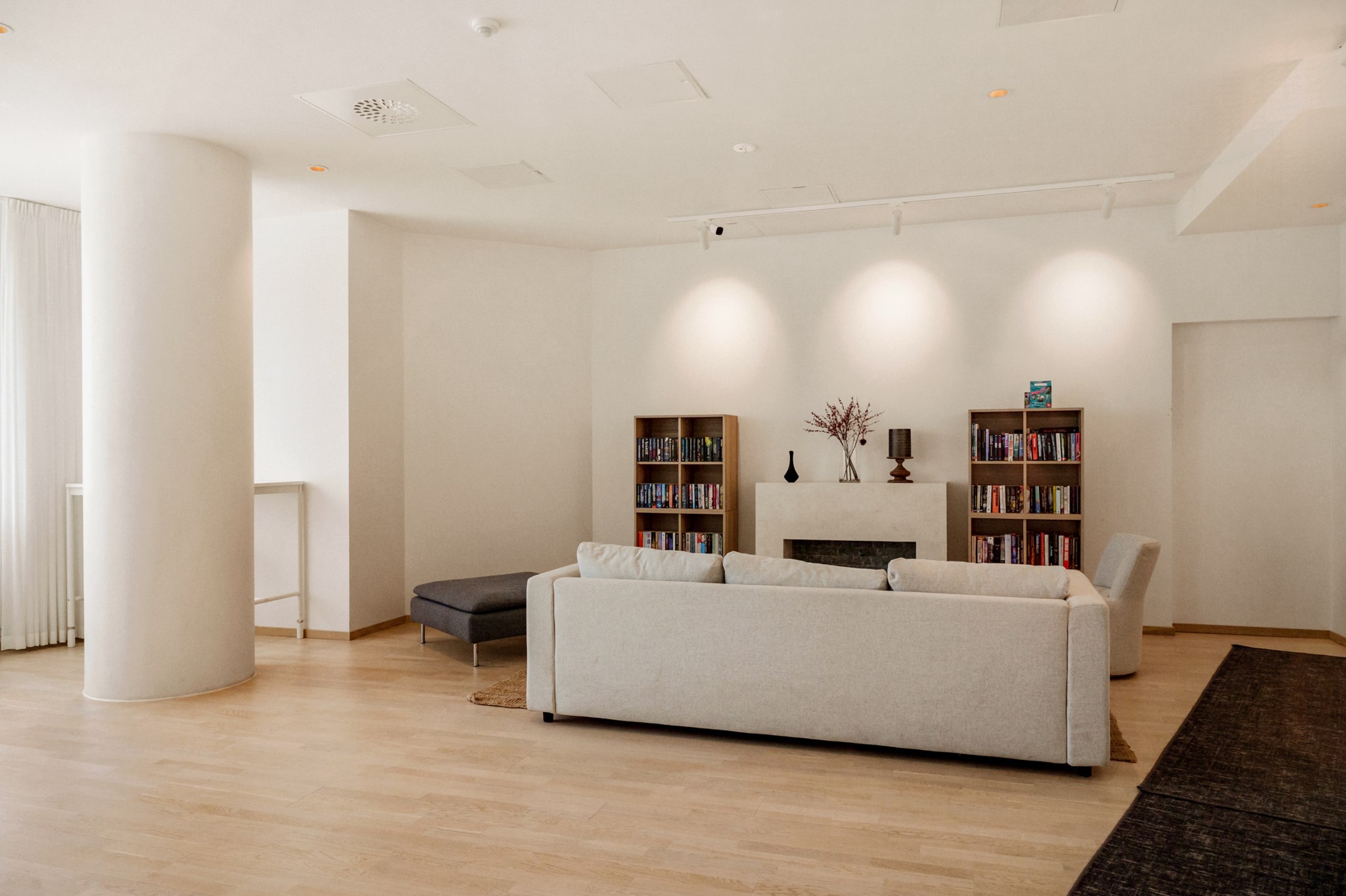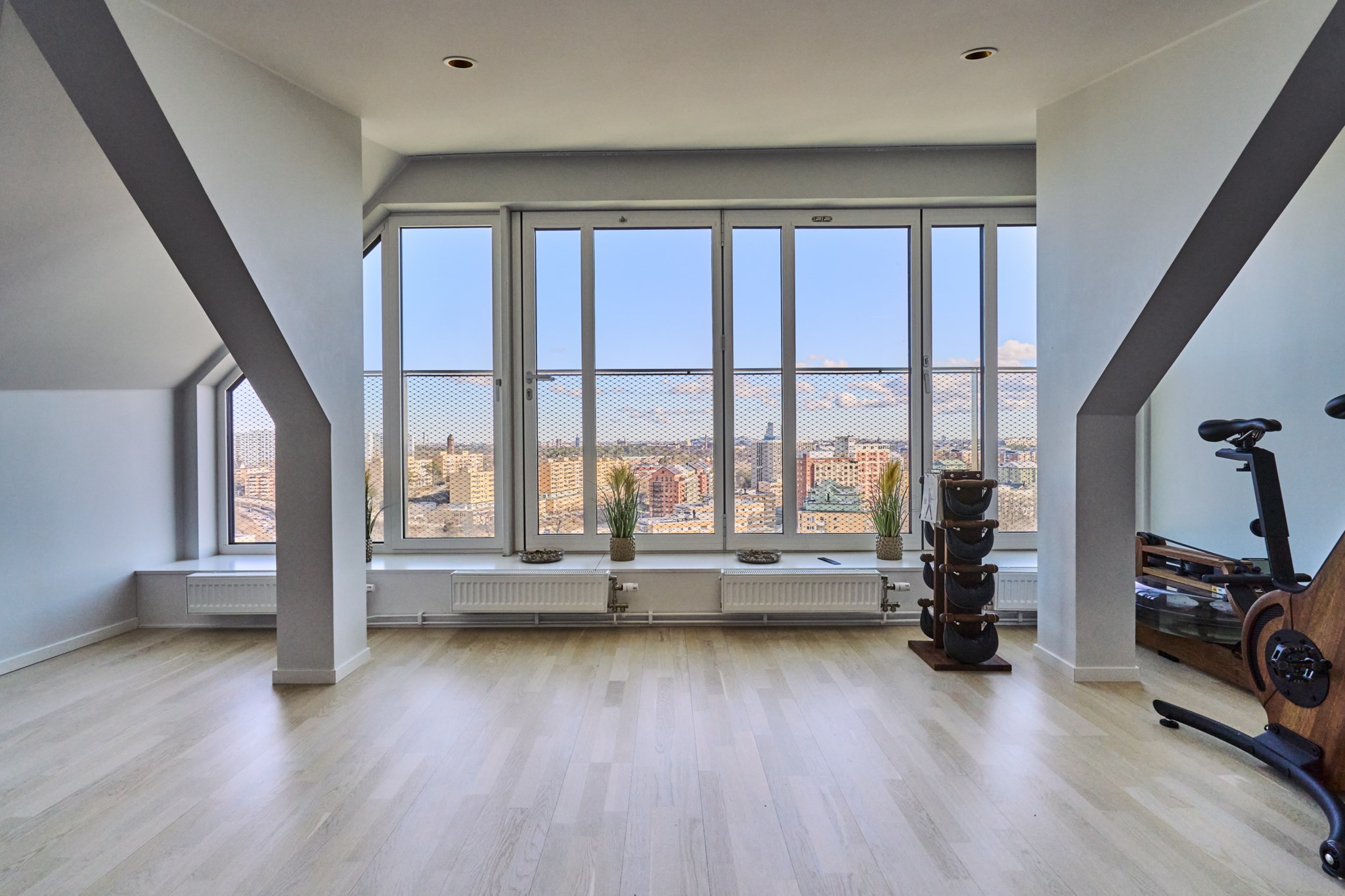 Bostaden präglas av öppen planlösning som skapar en luftig och social atmosfär. Takhöjden på över 3,8 meter i sovrummen ger en exceptionell rymd och karaktär – och för den som vill kan samma känsla enkelt skapas även i vardagsrum och kök.